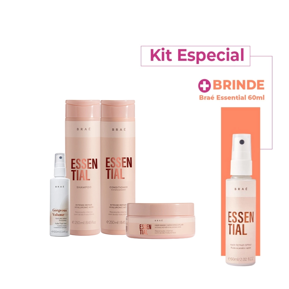 Este Kit Contém Braé Essential - Shampoo 250ml: para cabelos danificados e fragilizados, limpa e ajuda na recuperação dos fios desestruturados. Braé Essential - Condicionador 250ml: possui ação de nutrição e reparação, promove hidratação progressiva e protege o cabelo contra agressões diárias e térmicas. Com ácido hialurônico, aminoácidos e complexo de óleos, os cabelos ficam macios e com brilho. Possui proteção térmica. Braé Essential - Máscara 200g: recupera e protege a fibra capilar para que ela fique forte, brilhante e hidratada. Age internamente nos poros do cabelo para dar estrutura às áreas danificadas. Forma uma camada protetora em torno do fio para deixar o cabelo mais brilhante e resistente, com uma vida nova. Braé Gorgeous Volume - Spray Texturizador 100ml: para todos os tipos de cabelos. Proporciona um fio mais encorpado, com textura consistente por muito mais tempo. Tem fórmula livre de sal e parabenos, que equilibra e tonifica o couro cabeludo para controlar a oleosidade. Sua ação promove maior volume, brilho e força ao cabelo. Braé Mini Essential Hair Spray 60ml : para todos os tipos de cabelo, hidrata, fortalece e dá brilho aos fios, além de oferecer proteção térmica. Finalizador ideal para a sua rotina de hair care se tornar ainda mais prática e versátil. Um único produto que repara, hidrata, protege, reconstrói e proporciona brilho intenso à fibra capilar. Pode ser utilizado como finalizador ou tratamento reparador. Condicionador: deve ser usado após o shampoo, aplique massageando suavemente do comprimento às pontas. Deixe agir de 1 a 2 minutos. Enxague. Máscara: após lavar o cabelo com shampoo, aplique massageando vigorosamente da raiz até as pontas. Deixe agir de 10 a 15 minutos. Enxague. Finalizador: agite o produto antes de usar e aplique os cabelos limpos secos ou úmidos. Borrife mecha a mecha e pressionando suavemente as pontas. Não enxágue e finalize como desejar.Kit Braé Essential Máscara P Gorgeous Volume (4 produtos)