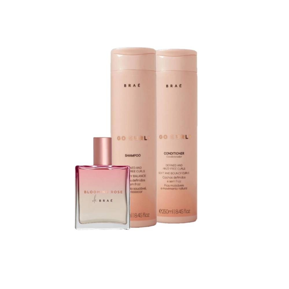 Este Kit Contém Braé Go Curly - Shampoo 250ml: possui uma associação equilibrada de ingredientes que permite a ação profunda e multifuncional nos cabelos cacheados e ondulados. Não possui silicones, petrolatos, parabenos e pode ser classificado como método Low Poo. Uma potente e inovadora combinação de ativos, traz hidratação imediata e de alto desempenho aos fios ondulados e cacheados. Braé Go Curly - Condicionador 250ml: sua formulação é composta por um Blend de Óleos Vegetais, Manteiga de Manga, Extrato de Linhaça, Lipídeos Biomiméticos, Proteínas, Leite de Coco Vetorizado com Algas e Esqualano Vegetal.Cachos definidos, redução de frizz, proteção do couro cabeludo, fios maleáveis e com movimento natural. Braé Blooming Rose - Perfume para Cabelo 50ml: especialmente desenvolvido para deixar uma aura perfumada e brilhante sobre os fios. Fórmula leve, não contém silicone e deixa o cabelo com aspecto natural e saudável. É absorvido rapidamente pelos fios deixando um aroma perfumado aonde quer que você vá. Conselho de Aplicação Shampoo: aplique no cabelo molhado, massageando suavemente sem esfregar os fios. Enxague. Condicionador: deve ser usado após o shampoo, aplique massageando suavemente do comprimento às pontas. Deixe agir de 1 a 2 minutos. Enxague. Perfume: pode ser usado no corpo e sobre os cabelos secos ou úmidos. Pulverize sobre os fios, penteando em seguida, para distribuir de maneira uniforme. Dica: Perfume Blooming Rose deve ser o último produto a ser usado em sua rotina, depois do shampoo, do condicionador e do finalizador. Kit Braé Go Curly Blooming Rose Trio (3 produtos)