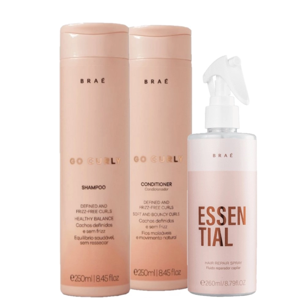 GO CURLY possui uma associação equilibrada de ingredientes que permite a ação profunda e multifuncional nos cabelos cacheados e ondulados. Não possui silicones, petrolatos, parabenos e pode ser classificado como método Low Poo. Uma potente e inovadora combinação de ativos, traz hidratação imediata e de alto desempenho aos fios ondulados e cacheados. Cachos definidos, redução de frizz, proteção do couro cabeludo, fios maleáveis e com movimento natural. Essential Fluido Reparador Leave-in com proteção térmica para todos os tipos de cabelo,epara, hidrata, fortalece, protege, reconstrói e proporciona brilho intenso a fibra capilar. Kit Contem: Braé Go Curly Shampoo 250ml Braé Go Curly Condicionador 250ml Braé Essential Fluido Reparador - Leave-in 260ml COMO USAR Conselho de aplicação Sobre os cabelos molhados, aplique o shampoo GO CURLY. Inicie massageando suavemente o couro cabeludo. E enxágue. Aplique o condicionador GO CURLY sobre os cabelos úmidos e limpos. Comece pelas pontas e massageie suavemente em direção à raiz. Deixe agir por alguns minutos e enxágue. Agite o Leave-in antes de usar. Com os cabelos úmidos ou secos, aplique uma pequena quantidade do fluido reparador Braé diretamente sobre o comprimento e pontas dos fios. Espalhe bem e finalize com como preferir. Ativos Principais Sua formulação é composta por um Blend de Óleos Vegetais, Manteiga de Manga, Extrato de Linhaça, Lipídeos Biomiméticos, Proteínas, Leite de Coco Vetorizado com Algas e Esqualano Vegetal.Kit Brae Go Curly Essential Trio Home (3 Produtos)