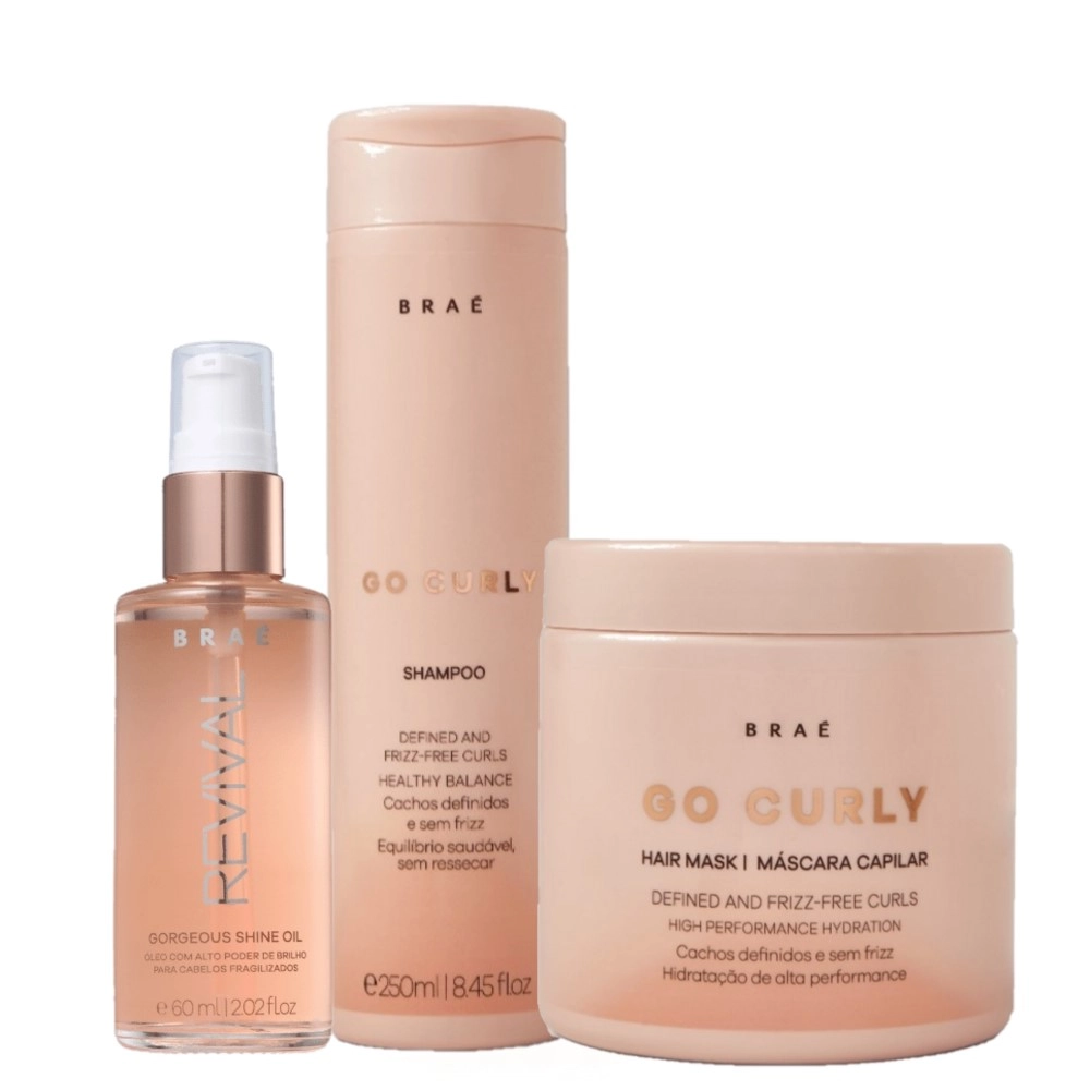 GO CURLY possui uma associação equilibrada de ingredientes que permite a ação profunda e multifuncional nos cabelos cacheados e ondulados. Não possui silicones, petrolatos, parabenos e pode ser classificado como método Low Poo. Uma potente e inovadora combinação de ativos, traz hidratação imediata e de alto desempenho aos fios ondulados e cacheados. Cachos definidos, redução de frizz, proteção do couro cabeludo, fios maleáveis e com movimento natural. BRAÉ Revival Gorgeous Shine Oil, Óleo para cabelos danificados e fragilizados, nutre e fortalece as pontas, além de devolver a vitalidade aos fios. Kit Contem: Braé Go Curly Shampoo 250ml Braé Go Curly Mascara Condicionante 500g Braé Revival Gorgeous Shine - Óleo Capilar 60ml COMO USAR Conselho de aplicação Sobre os cabelos molhados, aplique o shampoo GO CURLY. Inicie massageando suavemente o couro cabeludo. E enxágue. Sobre os cabelos limpos e úmidos, aplique uma quantidade generosa da máscara GO CURLY, enluvando, mecha a mecha, da raiz às pontas. Deixe agir de 5 a 10 minutos e enxágue. Coloque algumas gotas do óleo na palma das mãos. Espalhe no comprimento dos cabelos até completar a absorção. Finalize como desejar. Ativos Principais Sua formulação é composta por um Blend de Óleos Vegetais, Manteiga de Manga, Extrato de Linhaça, Lipídeos Biomiméticos, Proteínas, Leite de Coco Vetorizado com Algas e Esqualano Vegetal.Kit Brae Go Curly Shine Mask Hidratante (3 Produtos)