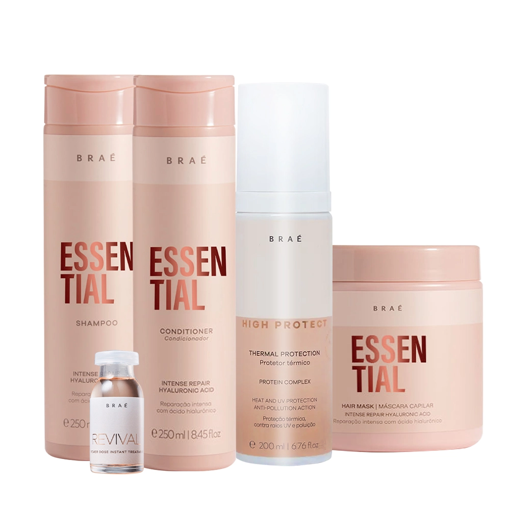 Esse Kit Contém Braé Essential - Shampoo 250ml: repara os fios danificados, promove hidratação progressiva e protege o cabelo contra agressões diárias e térmicas. Com ácido hialurônico, aminoácidos e complexo de óleos, os cabelos ficam mais fortalecidos. Braé Essential - Condicionador 250ml: possui ação de nutrição e reparação, promove hidratação progressiva e protege o cabelo contra agressões diárias e térmicas. Com ácido hialurônico, aminoácidos e complexo de óleos, os cabelos ficam macios e com brilho. Possui proteção térmica. Braé High Protect Thermal Protection - Leave-in Condicionante 200ml: fluído condicionante de proteção diária e evita danos causados por agentes externos. Garante proteção contra choques térmicos (de até 230°), além de reduzir o tempo de secagem do cabelo e proteger contra ação de raios UV e poluição. Braé Essential - Máscara 500g: tratamento reparador intensivo, possui fórmula com ácido hialurônico, aminoácidos e complexo de óleos poderosos que em conjunto, reparam agressões diárias dos fios danificados. Possui proteção térmica. Brae Revival Power Dose - Ampola de Tratamento 13ml (2 unidades): é uma ampola ultra concentrada com ação instantânea emoliente, indicada para cabelos danificados e desestruturados. A sinergia dos óleos de Ojon, Argan e Amêndoas fornecem as mais completas e essenciais reposição de substâncias para a recuperação imediata dos fios. Promove reconstrução, nutrição e regeneração em todas as camadas da fibra capilar. Para fios mais fortalecidos, hidratados e com brilho intenso. Conselho de AplicaçãoKit Braé High Protect Essential Máscara e Ampola (5 produtos)