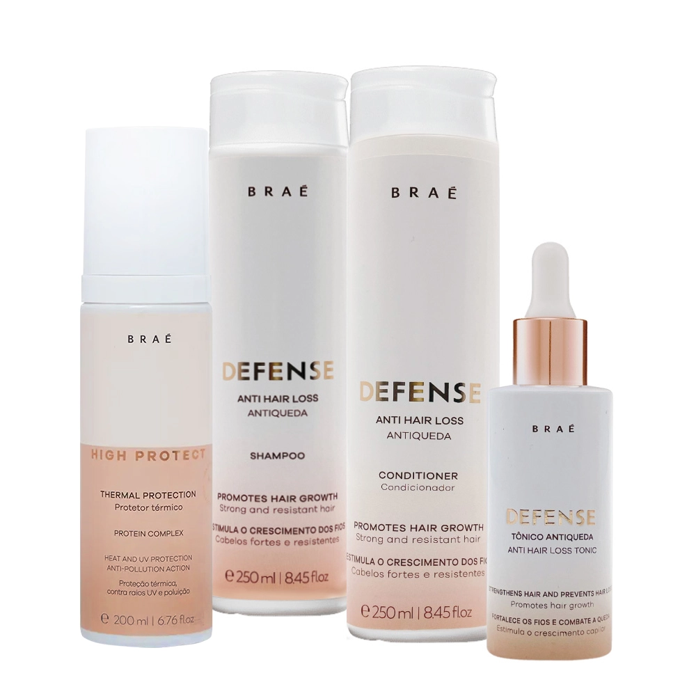 Esse kit contém Braé Defense Antiqueda Hair Loss - Shampoo 250ml: De ação fortalecedora e regeneradora, o Shampoo Defense nutre e tonifica o couro cabeludo, enquanto limpa e delicadamente, sem agredir a barreira cutânea ou ressecar os cabelos crescimento de fios fortes e resistentes e previne a queda de cabelo. Braé Defense Antiqueda Hair Loss - Condicionador 250ml: Alto poder vitalizante, o Condicionador Defense enquanto sela as cutículas e desembaraça, promove resistência, força e flexibilidade ao fio. Contém ativos antifiamento e biotina, que estimulam e melhoram o crescimento do cabelo, diminui a queda e recupera a espessura do fio. Braé Defense Antiqueda Hair Loss - Tônico Capilar 60ml: O tônico condicionante Defense traz uma associação de ativos de alta performance, comprovadamente eficazes no tratamento antiqueda age diretamente no bulbo capilar, estimulando o crescimento dos fios, evitando a queda e regulando as diferentes fases de crescimento dos cabelos. Braé High Protect Thermal Protection - Leave-in Condicionante 200ml: fluído condicionante de proteção diária e evita danos causados por agentes externos. Garante proteção contra choques térmicos (de até 230°), além de reduzir o tempo de secagem do cabelo e proteger contra ação de raios UV e poluição. Conselho de AplicaçãoKit Braé High Protect Thermal Duo Hair Loos e Tônico (4 produtos)
