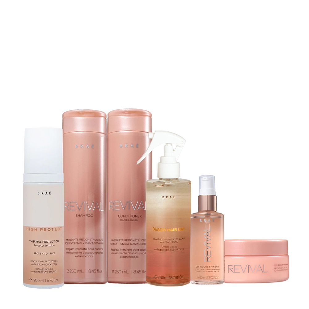 Esse kit contém BRAÉ Revival - Shampoo 250ml: limpa e ajuda na recuperação dos fios desestruturados. BRAÉ Revival - Condicionador 250ml: desembaraça e recupera a fibra capilar para trazer força e beleza aos fios. BRAÉ Revival - Máscara de Reconstrução 200g: recupera e protege a fibra capilar para que ela fique forte, brilhante e hidratada. Braé Beach Hair Day - Spray Finalizador 260ml: foi especialmente desenvolvido para deixar o cabelo com efeito “onda de praia”. São aquelas madeixas de quem acabou de sair do mar e deixou secar ao vento. Braé Revival Gorgeous Shine Oil - Oléo Capilar 60ml: repõe os lipídios perdidos e sela os fios para que o cabelo fique brilhante, resistente e disciplinado. Com o uso contínuo, a fórmula ainda previne a formação de pontas duplas. Braé High Protect Thermal Protection - Leave-in Condicionante 200ml: fluído condicionante de proteção diária e evita danos causados por agentes externos. Garante proteção contra choques térmicos (de até 230°), além de reduzir o tempo de secagem do cabelo e proteger contra ação de raios UV e poluição. Conselho de AplicaçãoKit Braé High Protect Thermal Duo Máscara Oil e Leave - in (6 produtos)