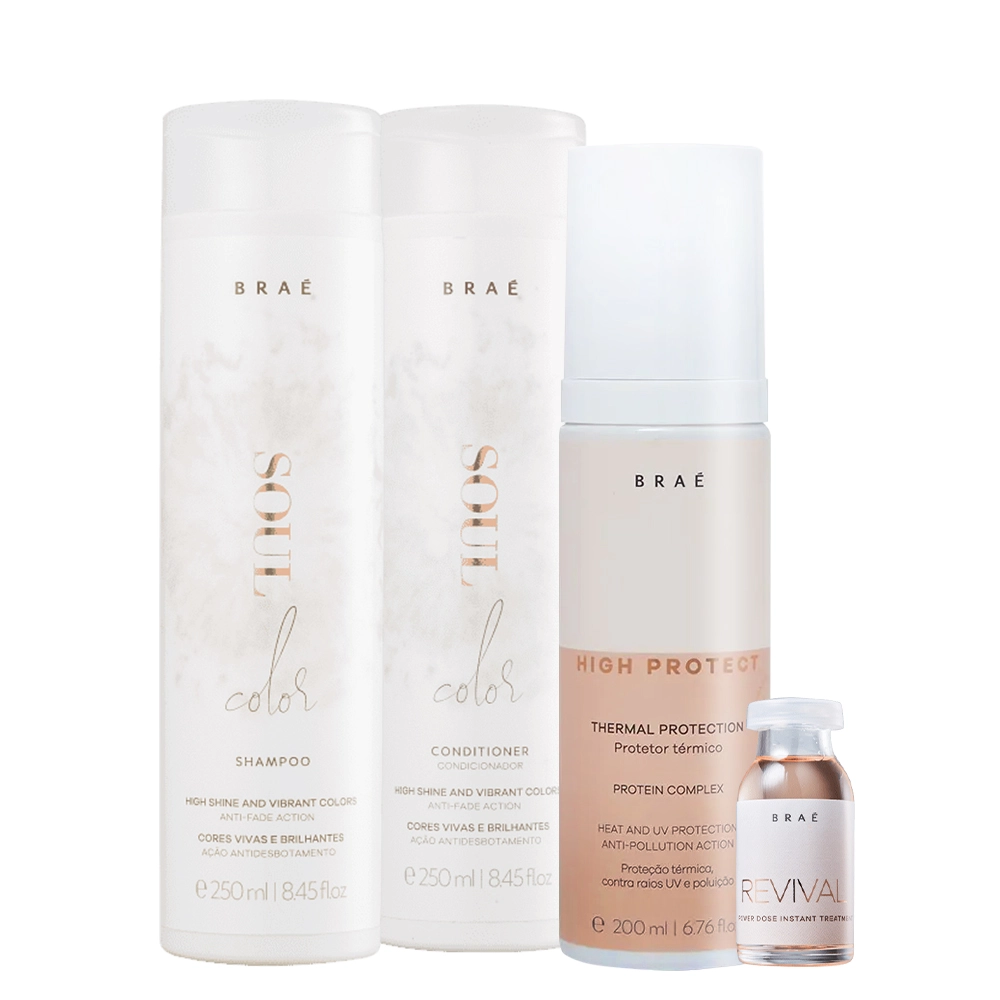 Esse Kit Contém BRAÉ Soul Color - Shampoo 250ml: desenvolvido especialmente para cabelos coloridos ou com mechas, higieniza os fios de forma suave, sua ação antioxidante e nutritiva, protege e renova os fios evitando o desbotamento da cor e os danos a fibra capilar. BRAÉ Soul Color - Condicionador 250ml: hidratante e desembaraçante, desenvolvido especialmente para cabelos coloridos ou com mechas, auxilia na proteção da cor e nos cuidados dos cabelos, deixando-os extremamente leves e com muito movimento. Sua ação antioxidante e nutritiva, protege e renova os fios evitando o desbotamento da cor e os danos a fibra capilar. Braé High Protect Thermal Protection - Leave-in Condicionante 200ml: fluído condicionante de proteção diária e evita danos causados por agentes externos. Garante proteção contra choques térmicos (de até 230°), além de reduzir o tempo de secagem do cabelo e proteger contra ação de raios UV e poluição. Brae Revival Power Dose Ampola de Tratamento 13ml: é uma ampola ultra concentrada com ação instantânea emoliente, indicada para cabelos danificados e desestruturados. A sinergia dos óleos de Ojon, Argan e Amêndoas fornecem as mais completas e essenciais reposição de substâncias para a recuperação imediata dos fios. Promove reconstrução, nutrição e regeneração em todas as camadas da fibra capilar. Para fios mais fortalecidos, hidratados e com brilho intenso. Conselho de AplicaçãoKit Braé High Protect Thermal Duo Soul Color e Ampola (4 produtos)