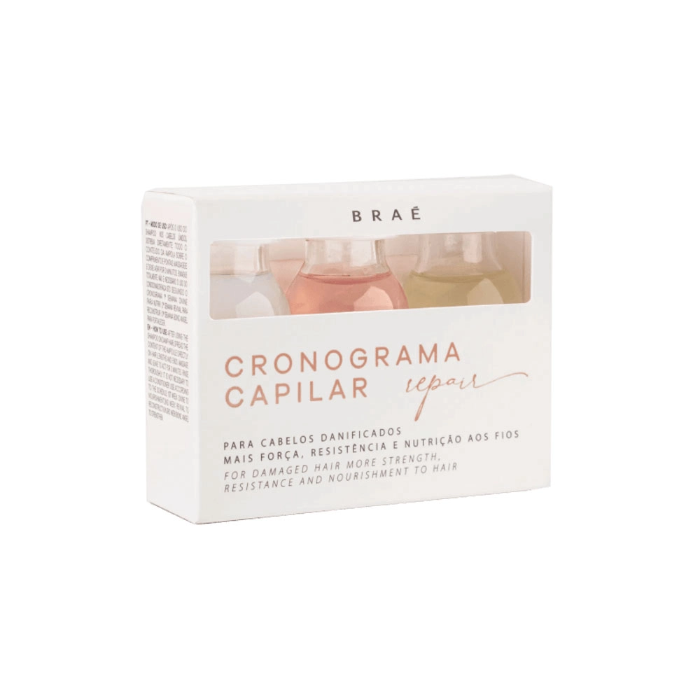 BRAÉ - Cronograma Capilar REPAIR: é indicado para promover ação fortificante, reparadora, nutritiva e hidratante da fibra capilar. Deixa os cabelos mais fortalecidos, livres de frizz, revitalizados e com brilho intenso. Um tratamento de 3 semanas que contém três linhas consagradas de Braé Hair Care para cabelos mais saudáveis sempre.