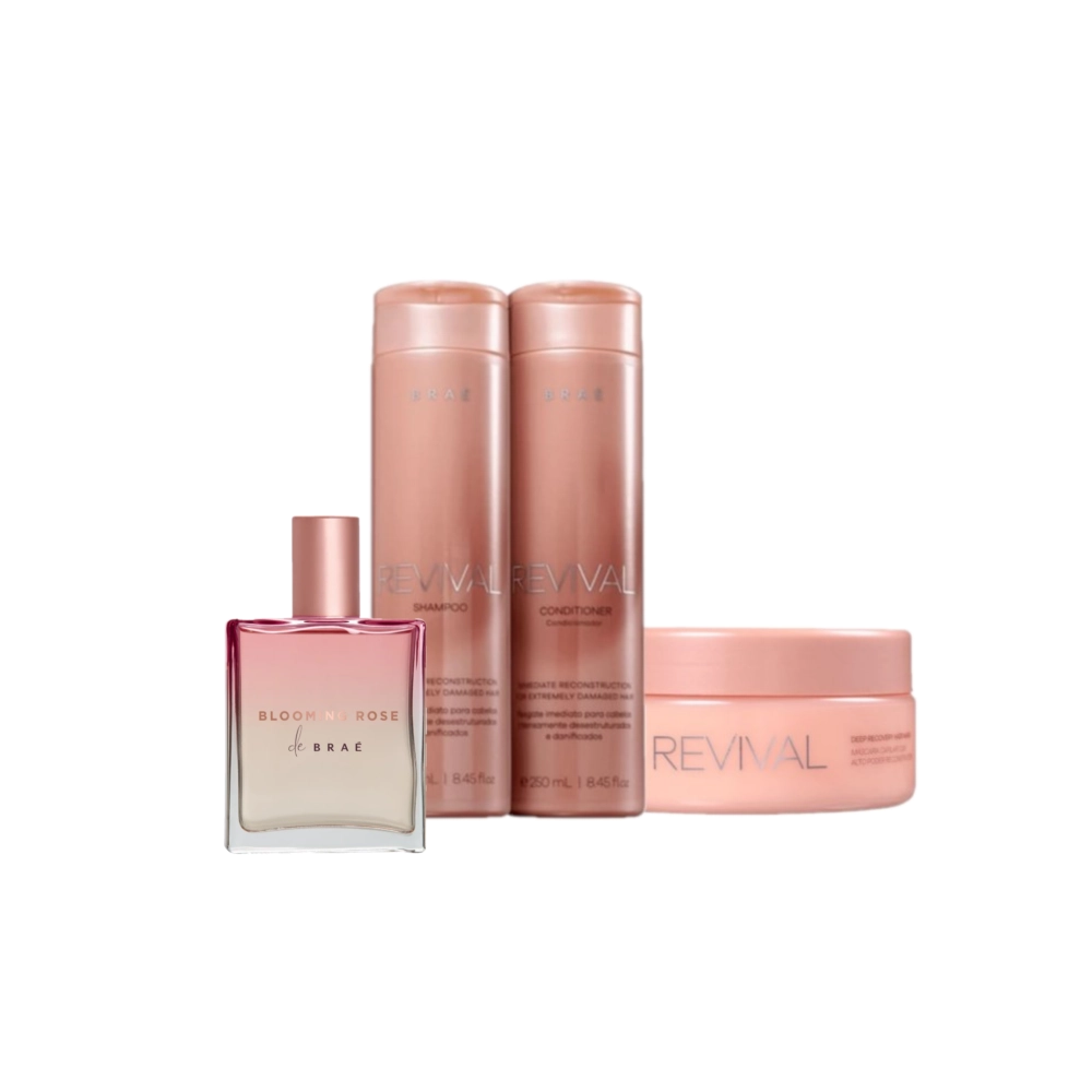 Este Kit Contém Braé Revival - Shampoo 250ml: para cabelos danificados e fragilizados, age na recuperação da fibra capilar para resgatar a força dos fios. Braé Revival - Condicionador 250ml: atua internamente nos poros do cabelo para dar estrutura às áreas danificadas. Seus compostos vitamínicos resgatam gradativamente as camadas sensibilizadas dos fios para deixar o cabelo mais brilhante e resistente, com uma vida nova. Braé Revival - Máscara Capilar 200g: age internamente nos poros do cabelo para dar estrutura às áreas danificadas. Forma uma camada protetora em torno do fio para deixar o cabelo mais brilhante e resistente, com uma vida nova. Braé Blooming Rose - Perfume para Cabelo 50ml: especialmente desenvolvido para deixar uma aura perfumada e brilhante sobre os fios. Fórmula leve, não contém silicone e deixa o cabelo com aspecto natural e saudável. É absorvido rapidamente pelos fios deixando um aroma perfumado aonde quer que você vá. Conselho de Aplicação Shampoo: aplique no cabelo molhado, massageando suavemente sem esfregar os fios. Enxague. Condicionador: deve ser usado após o shampoo, aplique massageando suavemente do comprimento às pontas. Deixe agir de 1 a 2 minutos. Enxague. Máscara: com os cabelos limpos e úmidos, aplique a máscara capilar, mecha a mecha, e massageie suavemente. Deixe agir durante 20 minutos. Em seguida, enxague bem. Perfume: pode ser usado no corpo e sobre os cabelos secos ou úmidos. Pulverize sobre os fios, penteando em seguida, para distribuir de maneira uniforme. Dica: Perfume Blooming Rose deve ser o último produto a ser usado em sua rotina, depois do shampoo, do condicionador e do finalizador. Kit Braé Revival Blooming Rose Quarteto (4 produtos)