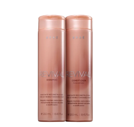 Kit BRAÉ Revival Duo (2 Produtos) O Kit BRAÉ Revival Duo atua internamente nos poros do cabelo para dar estrutura às áreas danificadas. Seus compostos vitamínicos resgatam gradativamente as camadas sensibilizadas dos fios para deixar o cabelo mais brilhante e resistente, com uma vida nova. Contém BRAÉ Revival - Shampoo 250ml: limpa e ajuda na recuperação dos fios desestruturados. BRAÉ Revival - Condicionador 250ml: desembaraça e recupera a fibra capilar para trazer força e beleza aos fios. Como Usar Espalhe o condicionador sobre os fios úmidos depois de usar o shampoo. Comece pelas pontas, massageie suavemente e deslize os fios entre os dedos até que estejam desembaraçados. Deixe agir por alguns minutos e enxágue. Nossos Experts Ensinam Tente diminuir o uso de secador, chapinha e babyliss enquanto seu cabelo estiver danificado. O calor deixa os fios mais fracos com o tempo. Saiba mais: O hair stylist Evandro Ângelo dá 5 motivos que fazem seu cabelo quebrar. Resultado Use também a Máscara BRAÉ Revival.
