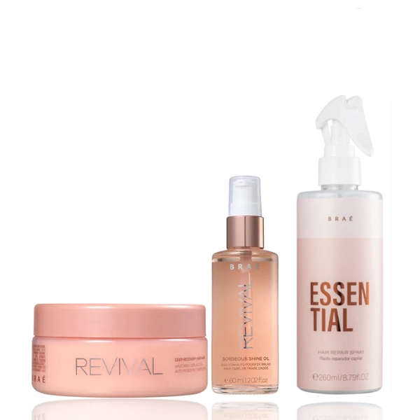 Kit de tratamento para cabelos danificados e fragilizados, recupera e protege a fibra capilar para que ela fique forte, brilhante e hidratada., além de devolver a vitalidade e a leveza. Age internamente nos poros do cabelo para dar estrutura às áreas danificadas. Forma uma camada protetora em torno do fio para deixar o cabelo mais brilhante e resistente, com uma vida nova. Neste Kit Contém Braé Revival - Máscara de Reconstrução 200g: age internamente nos poros do cabelo para dar estrutura às áreas danificadas. Forma uma camada protetora em torno do fio para deixar o cabelo mais brilhante e resistente, com uma vida nova. Braé Revival Gorgeous Shine - Óleo Capilar 60ml: repõe os lipídios perdidos e sela os fios para que o cabelo fique brilhante, resistente e disciplinado. Com o uso contínuo, a fórmula ainda previne a formação de pontas duplas. Leave-In Braé Essential Fluido Reparador: foi especialmente desenvolvido para facilitar a sua rotina de cuidados com os fios. Com formulação exclusiva e ingredientes de alta performance - como os já consagrados Ácido Hialurônico, Monoi Oil, Blend de Aminoácidos, Pantenol e Óleo de Coco -, o produto impede a ação danosa causada pelo calor emitido por ferramentas térmicas, promove brilho intenso, assegura toque macio e ainda protege de agressões externas. Como Usar Conselho de Aplicação Distribua a máscara mecha a mecha, começando pelas pontas. Massageie suavemente até chegar próximo à raiz. Deixe agir durante 25 minutos. Enxágue. Finalize como desejar. Antes de aplicar a máscara, remova o excesso de água do cabelo com uma toalha. Isso melhora a absorção da fórmula e garante uma ação mais intensiva dos ativos. Coloque algumas gotas do óleo na palma das mãos. Espalhe no comprimento dos cabelos até completar a absorção. Finalize como desejar. Evite passar o óleo próximo a raiz. Isso evita com que o visual fique com aspecto pesado e oleoso. Essential agite antes de usar. Com os cabelos úmidos ou secos, aplique uma pequena quantidade de produto diretamente sobre o comprimento e pontas dos fios. Espalhe bem e finalize com como preferir. Kit Braé Revival - Máscara de Reconstrução 200g Gorgeous Shine Oil 60ml Essential 260ml