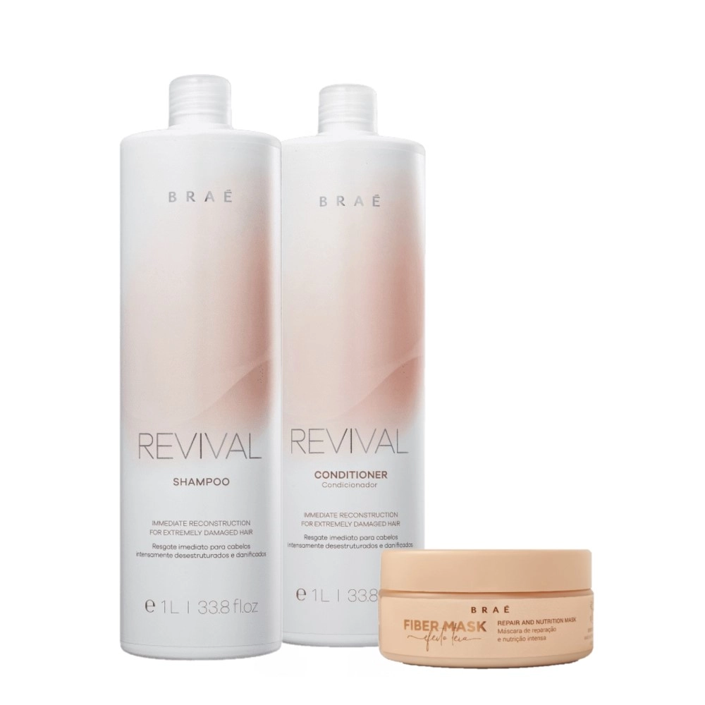 Kit para cabelos danificados e fragilizados. O Kit BRAÉ Revival Fiber age na recuperação da fibra capilar para resgatar a força dos fios. O Kit BRAÉ Revival Fiber atua internamente nos poros do cabelo para dar estrutura às áreas danificadas. Seus compostos vitamínicos resgatam gradativamente as camadas sensibilizadas dos fios para deixar o cabelo mais brilhante e resistente, com uma vida nova. Kit Contém: BRAÉ Revival - Shampoo 1L: limpa e ajuda na recuperação dos fios desestruturados. BRAÉ Revival - Condicionador 1L: desembaraça e recupera a fibra capilar para trazer força e beleza aos fios. BRAÉ Fiber Mask Mascara Condicionante Efeito Teia 200g: com tecnologia de nano regeneração com tripla ação: repara, hidrata e nutre intensamente os fios de dentro para fora. Com ativos que regeneram os fios danificados, repõem massa, devolvem elasticidade e fortalecem o brilho intenso. COMO USAR Conselho de aplicação Aplique o shampoo nos cabelos molhados e massageie o couro cabeludo até formar espuma. Enxágue. Repita o procedimento se sentir necessidade. 1. Espalhe uma pequena quantidade da máscara FIBER MASK na palma das duas mãos. Espalhe o condicionador sobre os fios úmidos depois de usar o shampoo. Comece pelas pontas, massageie suavemente e deslize os fios entre os dedos até que estejam desembaraçados. Deixe agir por alguns minutos e enxágue.Kit Brae Revival Regeneração Fiber (3 Produtos)