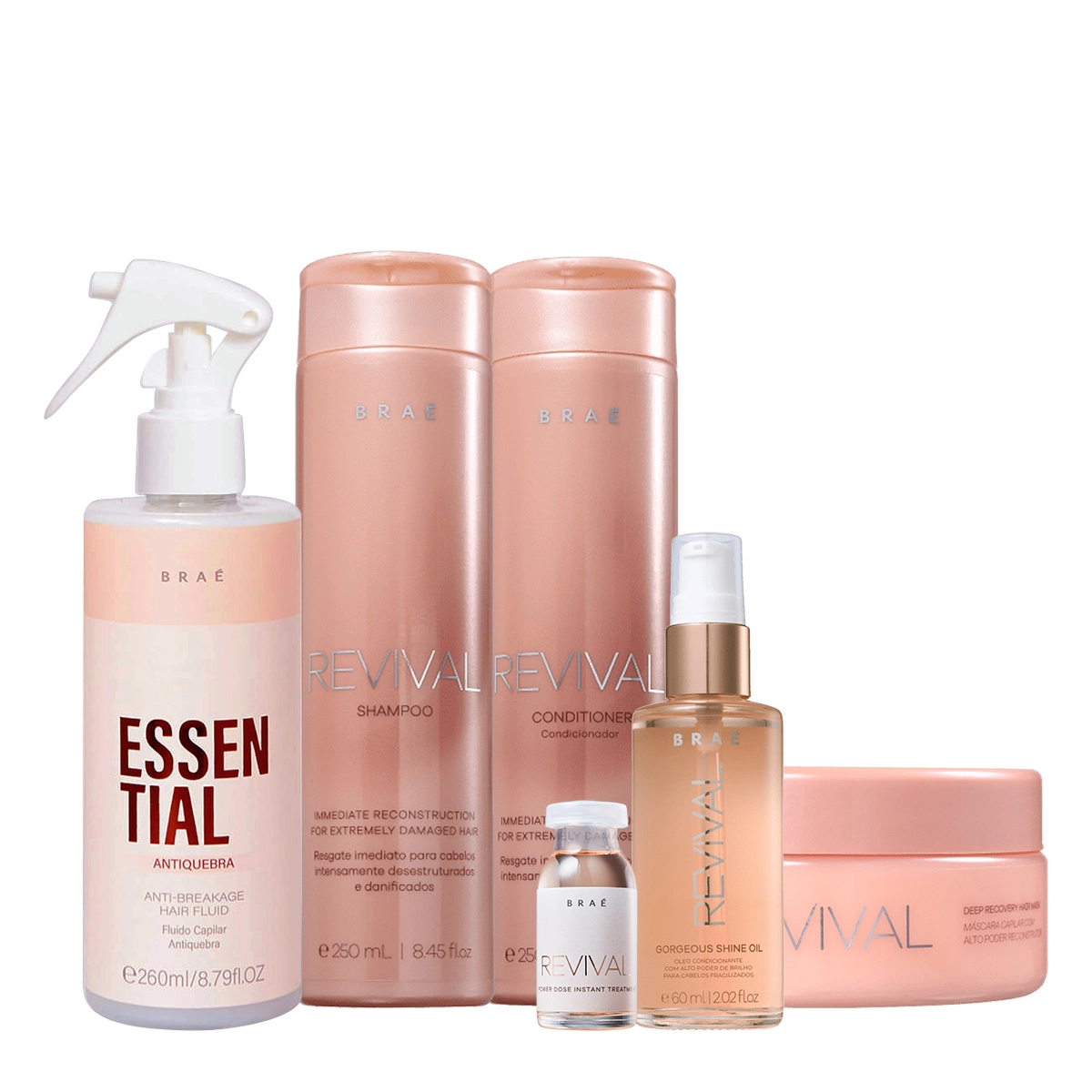 Kit Braé Revival Shampoo Condicionador Máscara Óleo Ampola e Essential Fluído Antiquebra (6 produtos)