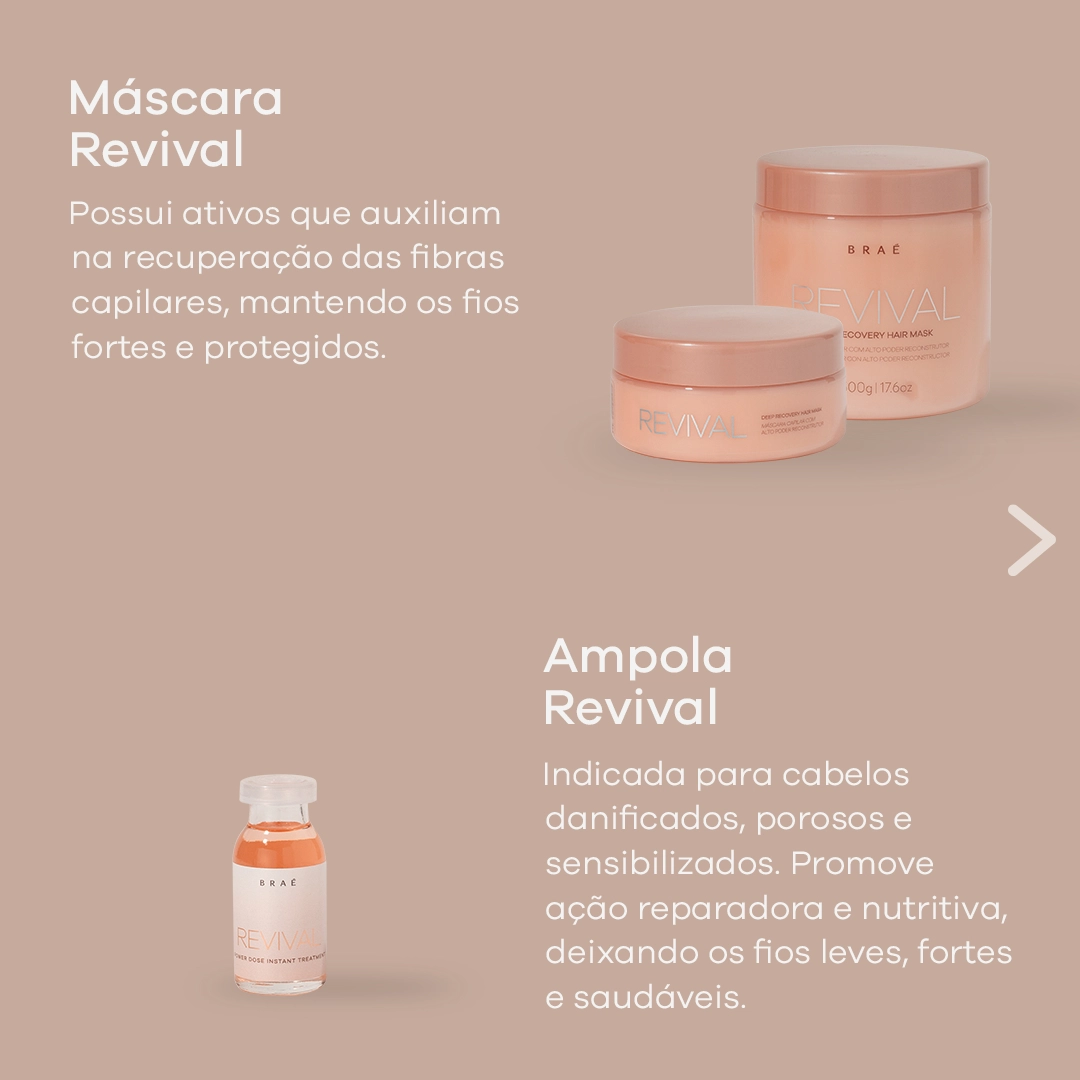 Esse kit Contém Braé Revival - Shampoo 250ml: limpa e ajuda na recuperação dos fios desestruturados. Braé Revival - Condicionador 250ml: desembaraça e recupera a fibra capilar para trazer força e beleza aos fios. Braé Revival - Máscara de Reconstrução 200g: recupera e protege a fibra capilar para que ela fique forte, brilhante e hidratada. Braé Revival Gorgeous Shine - Óleo Capilar 60ml: nutre e fortalece as pontas, além de devolver a vitalidade aos fios. Braé Essential Antiquebra - Fluido Capilar Condicionante 260ml: fluido capilar para fortalecer e proteger os cabelos fragilizados, sensibilizados e quebradiços. Com uma poderosa ação antiquebra, oferece proteção térmica e filtro solar, além de fortalecer a estrutura do fio, aumentar a resistência e promover a reconstrução de cabelos. Braé Revival - Ampola de Tratamento 13ml: uma ampola ultra concentrada com ação instantânea emoliente, indicada para cabelos danificados e desestruturados. A sinergia dos óleos de Ojon, Argan e Amêndoas fornecem as mais completas e essenciais reposição de substâncias para a recuperação imediata dos fios. Promove reconstrução, nutrição e regeneração em todas as camadas da fibra capilar. Para fios mais fortalecidos, hidratados e com brilho intenso. Conselho de Aplicação Kit Braé Revival Shampoo Condicionador Máscara Óleo Ampola e Essential Fluído Antiquebra (6 produtos)