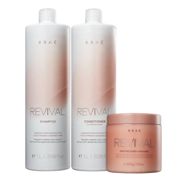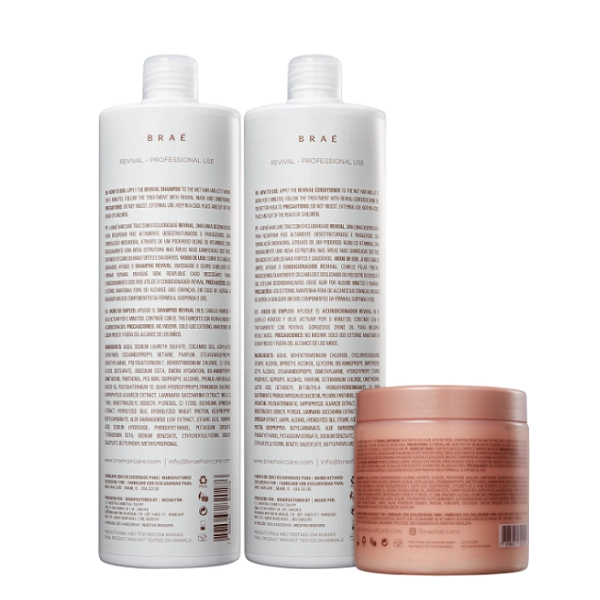 Kit de tratamento para cabelos danificados e fragilizados. Kit BRAÉ Revival forma uma camada protetora no fio e recupera os danos. Kit BRAÉ Revival repõe os nutrientes perdidos, melhora a elasticidade e restaura a saúde dos fios desde o seu interior. Perfeito para combater o frizz e garantir hidratação. Seu cabelo fica bonito e saudável rapidamente. Contém BRAÉ Revival - Shampoo 1000ml: faz uma limpeza suave e recupera os fios. BRAÉ Revival - Condicionador 1000ml: proporciona brilho, maciez e resgata as camadas sensibilizadas. BRAÉ Revival - Máscara de Reconstrução 500g: deixa o cabelo recuperado, resistente e com brilho. Conselho de Aplicação Aplique o shampoo no couro cabeludo molhado e massageie bem. Enxágue. Repita o procedimento se sentir necessidade. Em seguida, distribua a máscara mecha a mecha, começando pelas pontas. Massageie suavemente até chegar próximo à raiz. Deixe agir durante 25 minutos. Enxágue. Finalize com o condicionador no comprimento e pontas dos fios. Enxágue. Use a ponta dos dedos na hora de lavar o cabelo. Usar as unhas ou esfregar com força pode danificar e desgastar os fios, além de machucar a raiz. Brae Revival Shampoo e Condicionador 1L e Mascara 500g
