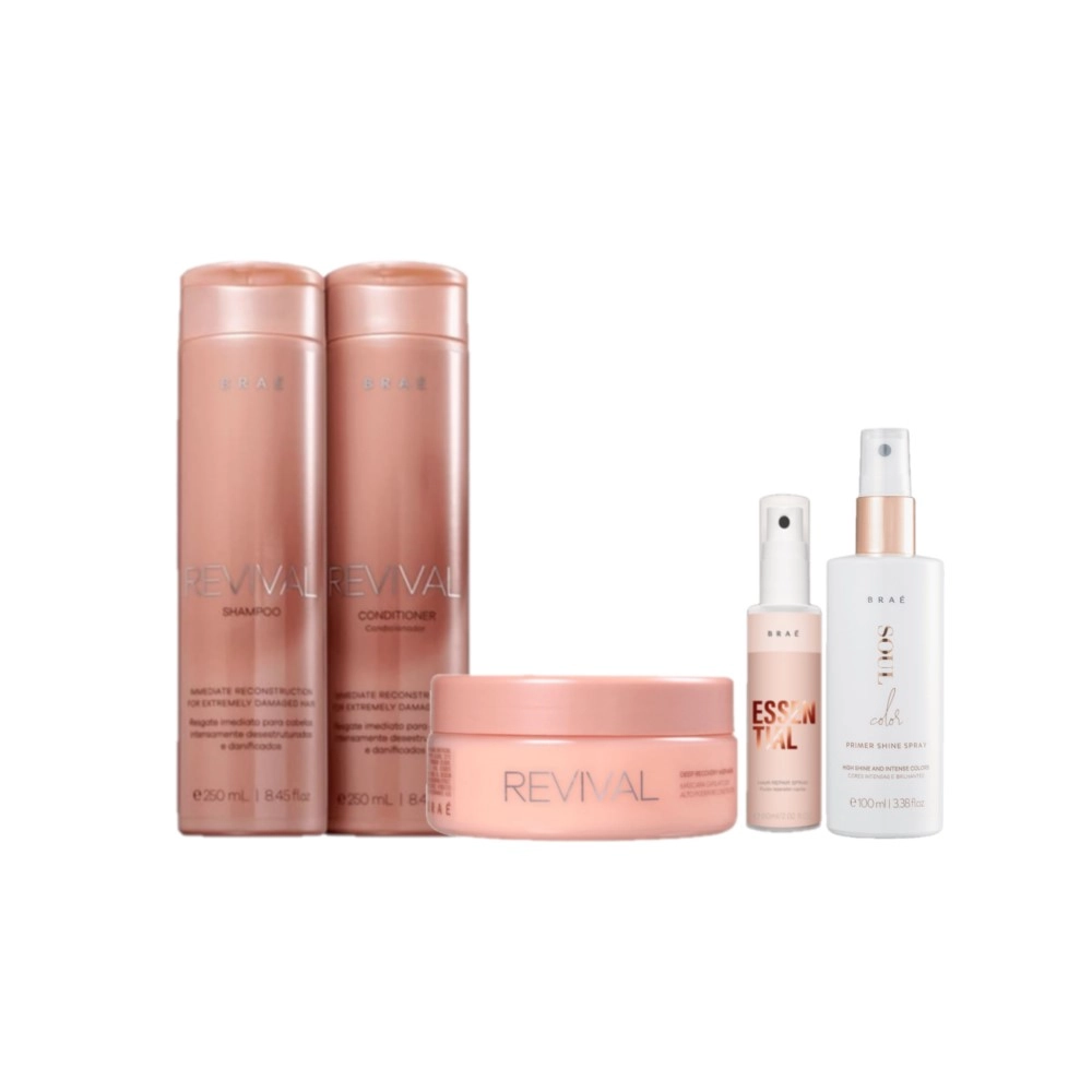 Este Kit Contém Braé Revival - Shampoo 250ml: para cabelos danificados e fragilizados, age na recuperação da fibra capilar para resgatar a força dos fios. Braé Revival - Condicionador 250ml: atua internamente nos poros do cabelo para dar estrutura às áreas danificadas. Seus compostos vitamínicos resgatam gradativamente as camadas sensibilizadas dos fios para deixar o cabelo mais brilhante e resistente, com uma vida nova. Braé Revival - Máscara Capilar 200g: age internamente nos poros do cabelo para dar estrutura às áreas danificadas. Forma uma camada protetora em torno do fio para deixar o cabelo mais brilhante e resistente, com uma vida nova. Braé Soul Color Prime Shine - Spray 100ml: fórmula exclusiva com óleo de Amla e Vitamina E, promove ação antioxidante e fortalecimento da fibra capilar, proporcionando fios mais resistentes, cabelos saudáveis, fios coloridos e brilhantes por muito mais tempo. Livre de parabenos. Braé Essential Fluido Reparador - Mini Leave-in 60ml: leave-in para todos os tipos de cabelo, hidrata, fortalece e dá brilho aos fios, além de oferecer proteção térmica. Finalizador ideal para a sua rotina de hair care se tornar ainda mais prática e versátil. Um único produto que repara, hidrata, protege, reconstrói e proporciona brilho intenso à fibra capilar. Pode ser utilizado como finalizador ou tratamento reparador. Conselho de Aplicação Shampoo: aplique no cabelo molhado, massageando suavemente sem esfregar os fios. Enxague. Condicionador: deve ser usado após o shampoo, aplique massageando suavemente do comprimento às pontas. Deixe agir de 1 a 2 minutos. Enxague. Máscara: com os cabelos limpos e úmidos, aplique a máscara capilar, mecha a mecha, e massageie suavemente. Deixe agir durante 20 minutos. Em seguida, enxague bem. Leave-in: agite antes de usar. Com os cabelos úmidos ou secos, aplique no comprimento e pontas uma quantidade suficiente para envolver os fios, penteie e massageie suavemente proporcionando melhor espalhabilidade nos cabelos. Finalize como desejar.Kit Braé Revival Soul Color Prime Mini Essential (5 produtos)