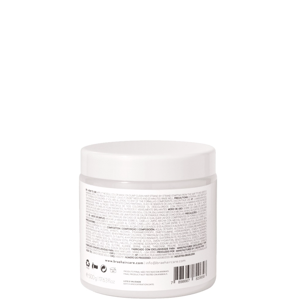 Kit BRAE Soul Color - Mascara 500g (2 Unidades) Hidratante e nutritiva, sela as cutículas evitando que os fios percam os pigmentos depositados no interior da fibra proporcionando maior durabilidade da cor. Como Usar Conselho de Aplicação Aplique a máscara nos cabelos limpos e úmidos, massageie mecha a mecha, deixe agir entre 10 e 20 minutos. Enxágue totalmente o produto.