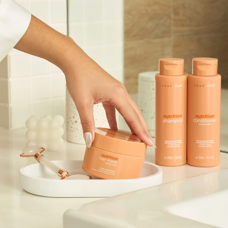 Braé Stages Nutrition - Máscara 200g: combina óleos naturais e lipoproteínas para devolver vitalidade, força e maciez aos cabelos, promovendo nutrição profunda.
