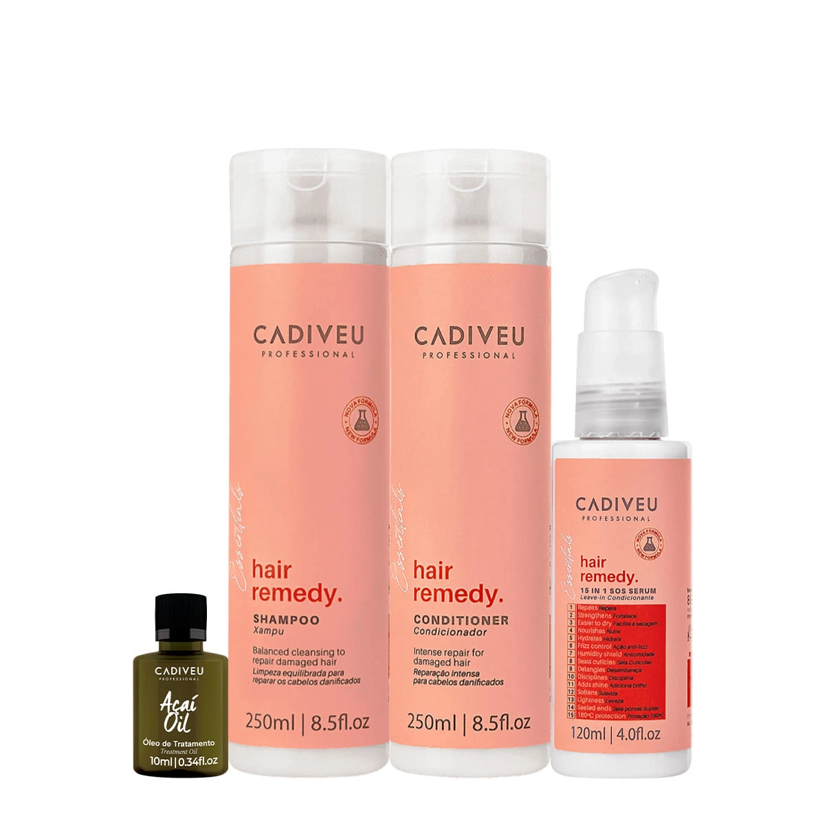 Kit Cadiveu Essentials Hair Remedy Shampoo Condicionador Leave-in Sérum e Açaí Oil (4 produtos)