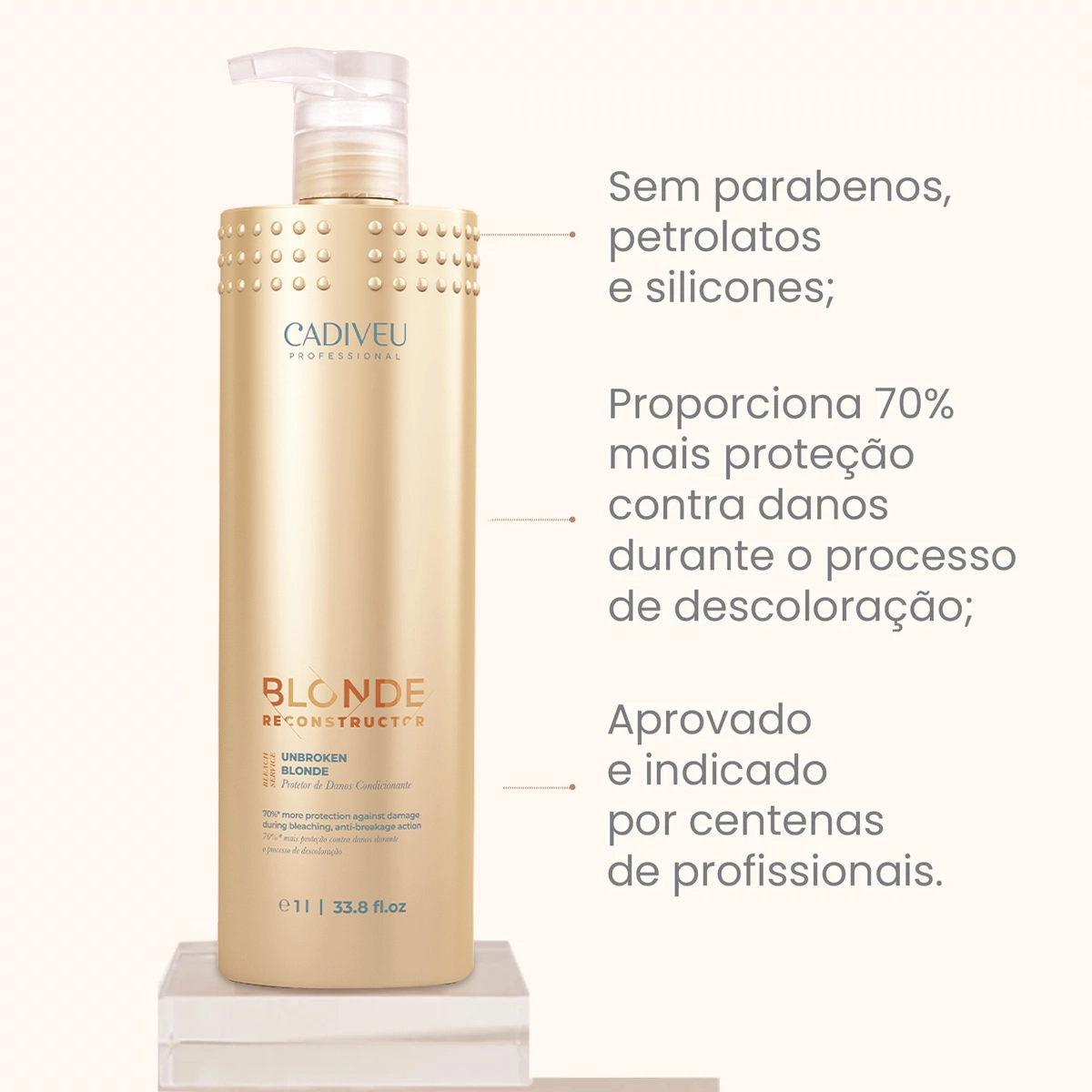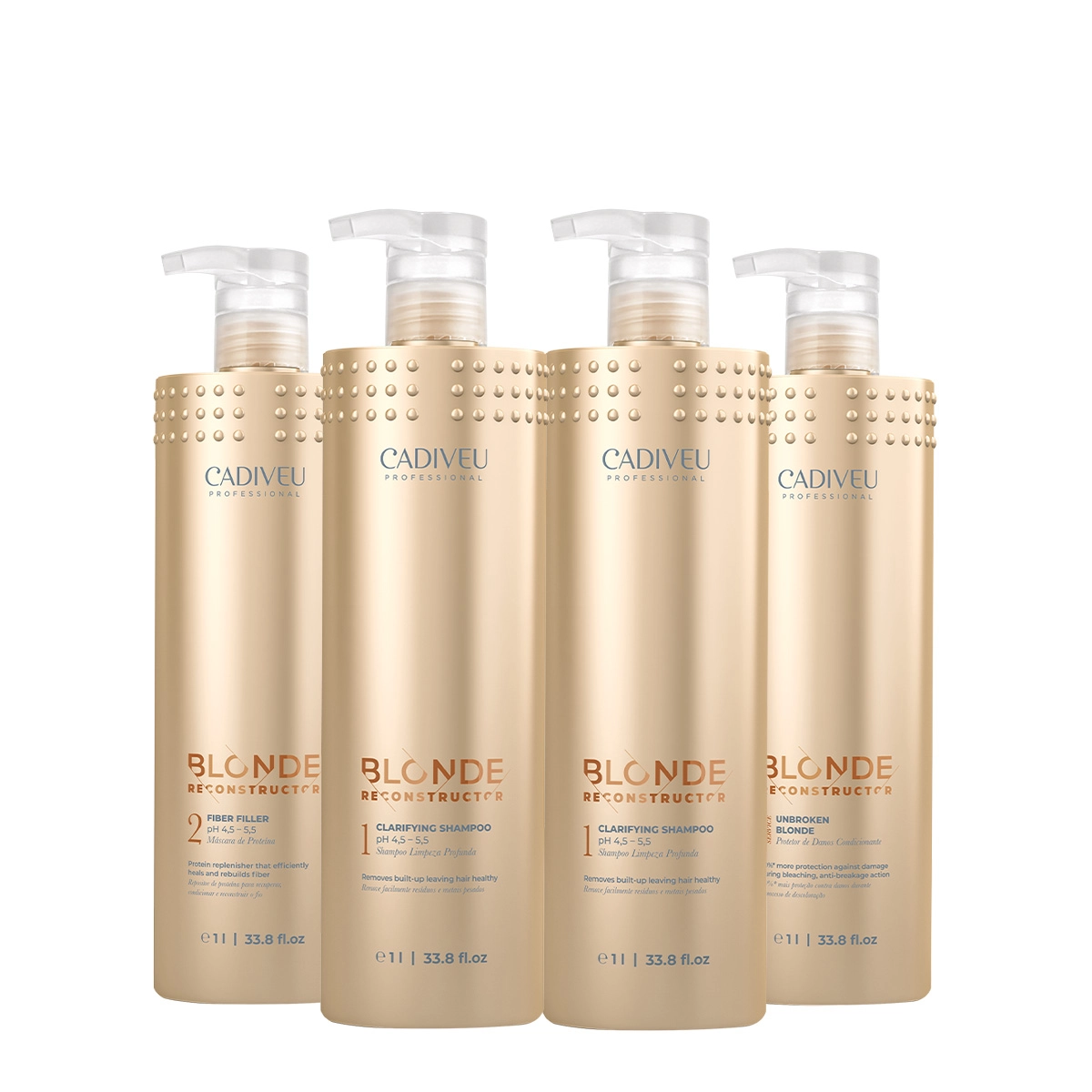 Esse Kit Contém Cadiveu Professional Blonde Reconstructor Clarifying - Shampoo 1L (2 unidades): tratamento purificante com pH ligeiramente ácido, que remove profundamente metais pesados e sais minerais, ainda, evita reações indesejadas durante o processo de descoloração e melhora a absorção de nutrientes em tratamentos cosméticos. Blindagem avançada que promove máxima proteção durante o processo de transformação, protegendo os fios da ação destrutiva dos descolorantes em até 70%, garantindo fios inquebráveis e radiantes. Cadiveu Professional Blonde Reconstructor Fiber Filler - Máscara de Reconstrução 1L: desenvolvida para tratamento dos fios loiros, descoloridos, coloridos e com mechas, pré e pós o processo de transformação, a fim de manter os cabelos intactos e saudáveis, pois possui pH ligeiramente ácido e proteínas de baixo peso molecular, que recupera internamente a fibra capilar desde o córtex e reforça a resistência dos cabelos contra quebra e danos futuros. Cadiveu Professional Blonde Reconstructor Unbroken - Condicionador 1L: possui sistema anti danos que protege os fios dos cinco principais problemas da descoloração: quebra, frizz, porosidade, amarelamento e esverdeamento por piscina. Seu uso proporciona 70% mais proteção, mantendo a saúde do cabelo intacta. Blinda e bloqueia a ação destrutiva dos descolorantes, além de ser um grande aliado dos profissionais, garantindo até 25 serviços de mechas com um único frasco. Conselho de AplicaçãoKit Cadiveu Professional Blonde Reconstructor Shampoo Extra Filler Máscara e Condicionador (4 produtos)