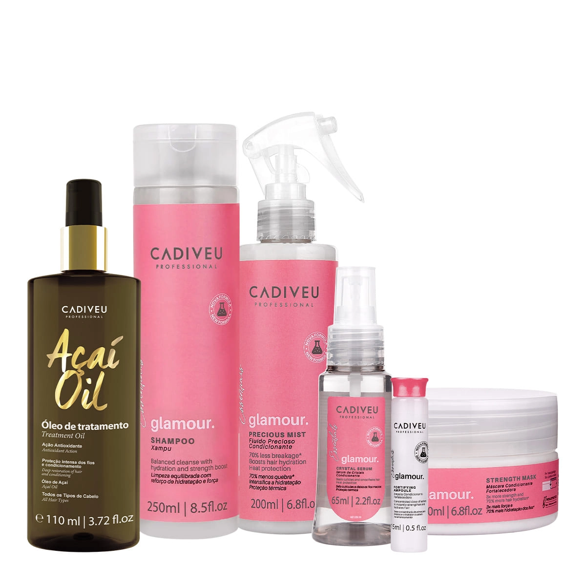 Kit Cadiveu Professional Essentials Glamour Shampoo Máscara Fluído Ampola Sérum e Açaí Oil 110 (6 produtos)