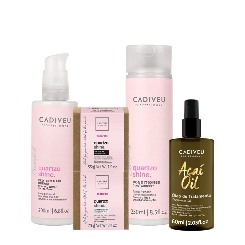 Esse Kit Contém Cadiveu Essentials Quartzo Shine Hair Proteína Condicionante - Pré-Shampoo 200ml: para cabelos secos e opacos. é um produto versátil que garante aquela “forcinha” extra para os fios em um tratamento intensivo de força, maciez e brilho. A proteína pode ser inclusa no seu cronograma capilar. resultado é um cabelo poderoso, nutrido e cheio de brilho. A Proteína é um booster multifuncional doador de nutrientes para reparar e nutrir os fios, aumentando o brilho, deixando os cabelos mais macios e com aspecto saudável. Para uso em cabelos cacheados, a proteína ainda tem efeito de definição dos cachos. Esse booster poderoso é formulado com proteínas e óleos vegetais, podendo ser usado como máscara, leave-in ou como pré-shampoo, já que tem formulação leve e sem silicone, dando um toque suave aos fios. Cadiveu Professional Essentials Quartzo Shine - Shampoo em Barra 70g: conta com fórmula concentrada, rica em nutrientes e ingredientes de origem natural, capaz de tornar os cabelos brilhantes, macios e saudáveis através de uma nova experiência de limpeza dos fios. Cadiveu Professional Essentials Quartzo Shine - Condicionador 250ml: traz o equilíbrio perfeito entre partículas de quartzo rosa e polímeros para garantir um toque sedoso aos fios. Tenha o cuidado diário que deixa os cabelos livres, leves e soltos! Cadiveu Professional Essentials Quartzo Shine - Máscara de Tratamento em Barra 55g: tratamento em barra para cabelos secos e opacos. nutre e deixar os cabelos brilhantes e macios de uma vez só, podendo ser usado diariamente, proporcionando uma diferença no toque desde o primeiro uso. Cadiveu Professional Açaí Oil - Óleo de Tratamento Capilar 60ml: para restauração e nutrição de cabelos danificados. Sua fórmula ultraleve e não gordurosa é rapidamente absorvida sem deixar resíduos. Age na cutícula dos fios que é a parte mais danificada no dia a dia. Açaí Oil de Cadiveu nutre, hidrata e reaviva cabelos danificados de todos os tipos, sela e repara as pontas duplas, controla o frizz e protege contra os danos do sol, poeira, vento, umidade, secador e prancha. O segredo da Amazônia revelado na beleza de seus cabelos, um verdadeiro elixir para deixar os cabelos sedosos, nutridos, macios e com brilho sem igual. Conselho de AplicaçãoKit Cadiveu Professional Essentials Quartzo Shine Shampoo Barra Condicionador Máscara Barra Pré-Shampoo e Açaí Oil 60 (5 produtos)