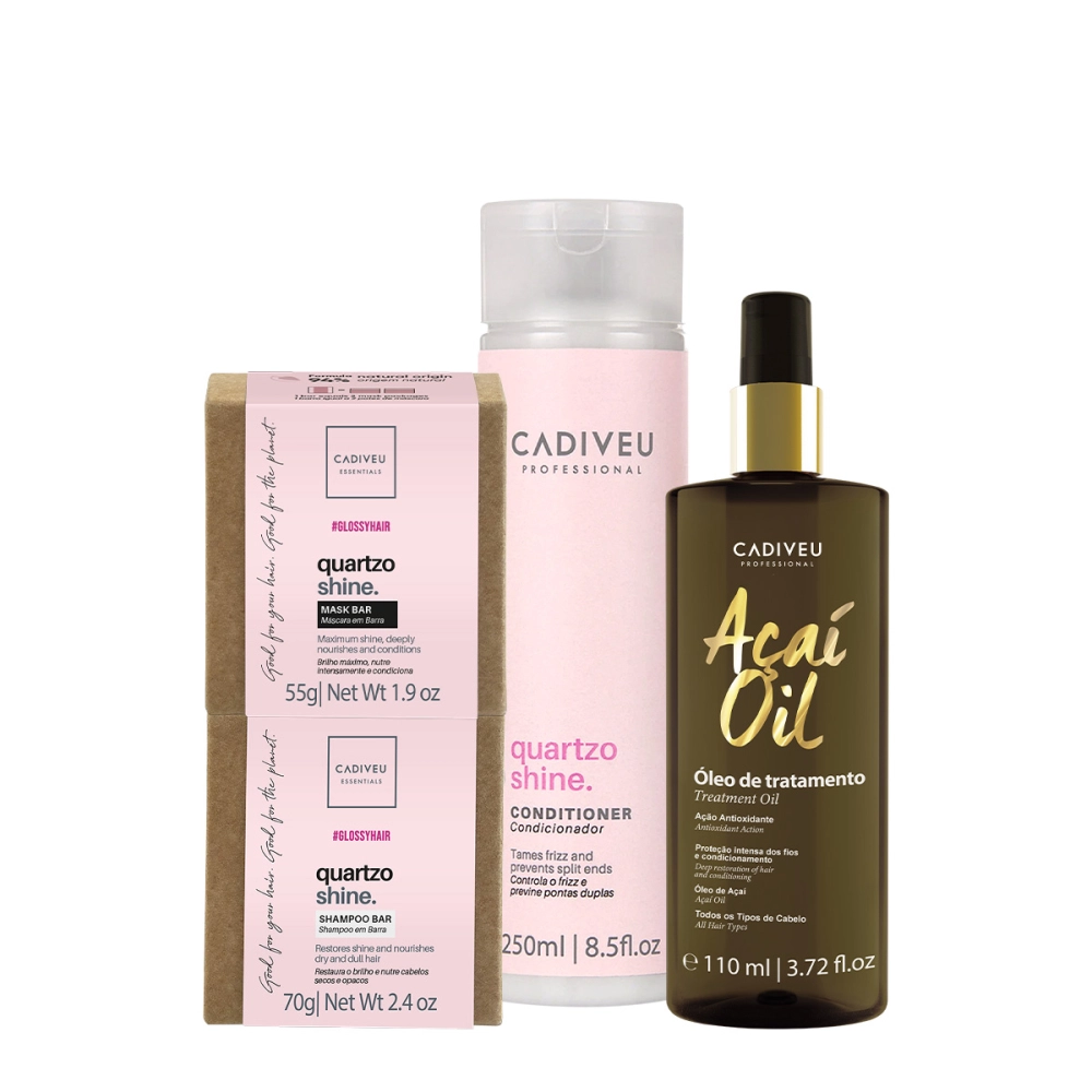 Kit Cadiveu Professional Essentials Quartzo Shine Shampoo em Barra Condicionador Máscara em Barra e Açaí Oil 110 (4 prod