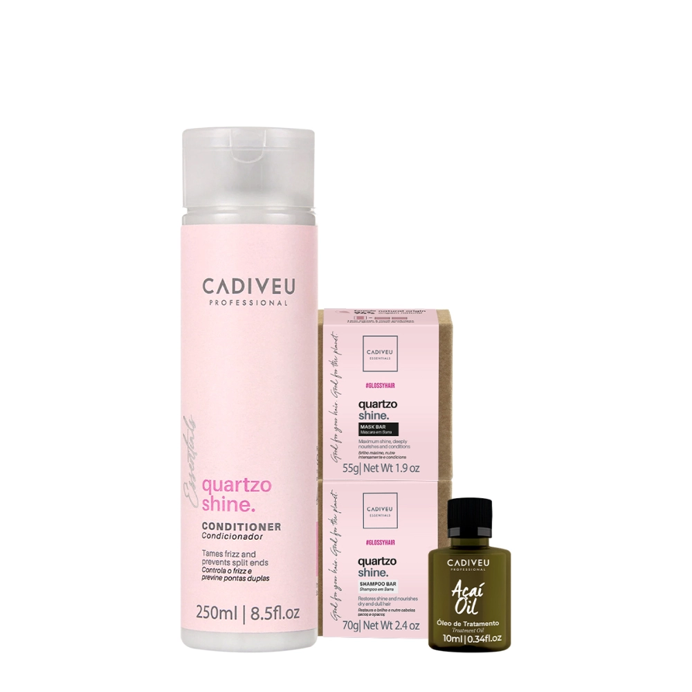 Kit Cadiveu Professional Essentials Quartzo Shine Shampoo em Barra Condicionador Máscara em Barra e Açaí Oil (4 produtos