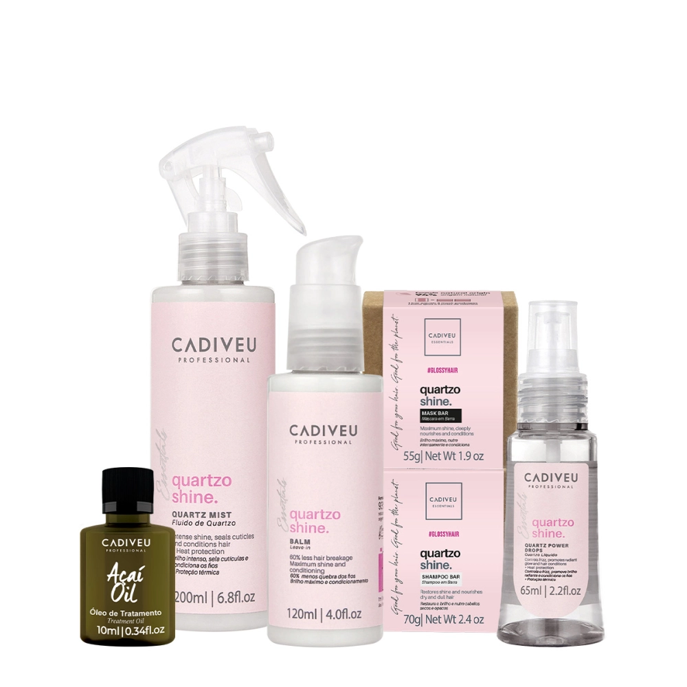 Esse Kit Contém Cadiveu Essentials Quartzo Shine - Shampoo em Barra 70g: você escolhe diariamente não acumular mais plástico no seu banheiro e de quebra apoia na redução de água, fazendo parte de um movimento de beleza consciente. O produto conta com fórmula concentrada, rica em nutrientes e ingredientes de origem natural, capaz de tornar os cabelos brilhantes, macios e saudáveis através de uma nova experiência de limpeza dos fios. Vegano, com zero de água na formulação, e zero plástico, um clean beauty, que faz bem para o cabelo, e bem para o planeta, além de tudo ainda é econômico, já que uma barrinha equivale à aproximadamente dois frascos de shampoo e tem rendimento de até 50 lavagens. Cadiveu Essentials Quartzo Shine - Máscara de Tratamento em Barra 55g: máscara de tratamento em barra para cabelos secos e opacos. nutre e deixar os cabelos brilhantes e macios de uma vez só, podendo ser usado diariamente, proporcionando uma diferença no toque desde o primeiro uso. Cadiveu Essentials Quartzo Shine - Óleo Capilar Quartzo Líquido 65ml: para cabelos secos e opacos. Ele dá aquele UP nas madeixas e deixa os fios mais brilhosos, com menos arrepiado e sem pontas duplas, sendo a opção perfeita para usar diariamente e ter sempre à mão no banheiro ou na bolsa. Cadiveu Professional Quartzo Shine - Fluído Condicionante 200ml: sua fórmula ultraleve, enriquecida com Quartzo Rosa, proporciona um brilho excepcional aos fios, eliminando qualquer aspecto ressecado. Com uma textura aquosa que não pesa nos fios, facilita a escovação e promove um alinhamento perfeito após a finalização, garantindo também o selamento das cutículas capilares. Cadiveu Professional Hair Quartzo Shine Balm - Leave-in 120ml: traz uma fórmula super leve que não pesa no cabelo. Com ingredientes especiais, reduz pontas duplas, sela as cutículas, repara a fibra capilar e confere muita maciez e brilho intenso. Além disso, o uso contínuo proporciona 60% menos quebra dos fios. É ideal para garantir uma finalização perfeita. Cadiveu Professional Açaí Oil - Óleo Capilar De Tratamento 10ml: Sua fórmula exclusiva restaura e nutre os cabelos danificados, deixando-os macios, brilhantes e flexíveis. Com proteção térmica, este óleo capilar é ideal para proteger os cabelos dos danos causados pelo calor de ferramentas de styling, como secadores e chapinhas. é fácil de usar. Basta aplicar sobre os cabelos úmidos ou secos, antes ou após a modelagem. E a melhor parte? Ele pode ser misturado a hidratações, colorações e descolorações para proteção e nutrição dos fios. Conselho de AplicaçãoKit Cadiveu Professional Hair Quartzo Shine Barra e Açaí Óleo 10ml (6 produtos)