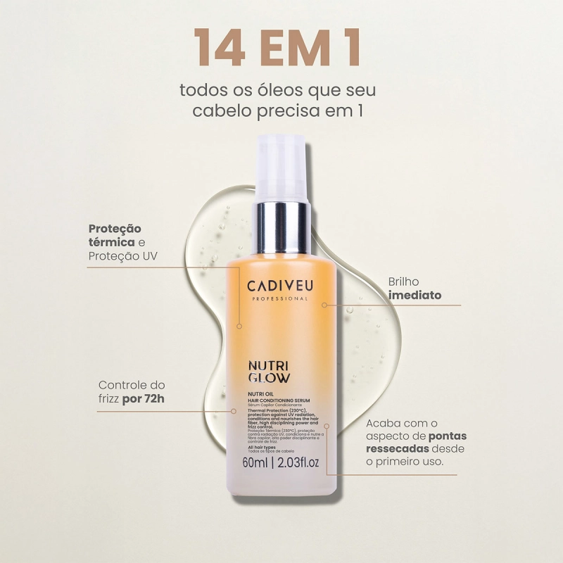 Kit Cadiveu Professional Nutri Glow - Ritual Nutritivo com Proteção Térmica Este Kit Contém Cadiveu Professional Nutri Glow - Shampoo Sem Sulfato 250ml: limpa suavemente e repõe lipídios essenciais, devolvendo brilho, movimento e vitalidade aos fios secos e sem vida. Cadiveu Professional Nutri Glow - Condicionador 250ml: nutre profundamente, reduz o frizz e proporciona maciez, movimento natural e toque de seda para todos os tipos de cabelo. Cadiveu Professional Nutri Glow - Máscara Nutritiva Condicionante 200ml: com tecnologia Oil Elixir, oferece recarga máxima de nutrição e brilho 8x maior, selando as cutículas e controlando o frizz por mais tempo. Cadiveu Professional Nutri Glow - Fluído Nutritivo Leave-in 215ml: promove movimento, maciez e toque sedoso. Conta com proteção térmica de até 230ºC, que facilita a secagem e protege os cabelos contra o frizz por 72 horas. Forma um escudo protetor de umidade em até 85%. Cadiveu Professional Nutri Glow - Óleo Capilar 60ml: com 12 óleos vegetais e manteiga de karité, repara, alinha e ilumina os fios, garantindo nutrição profunda sem pesar. Conselho de Aplicação