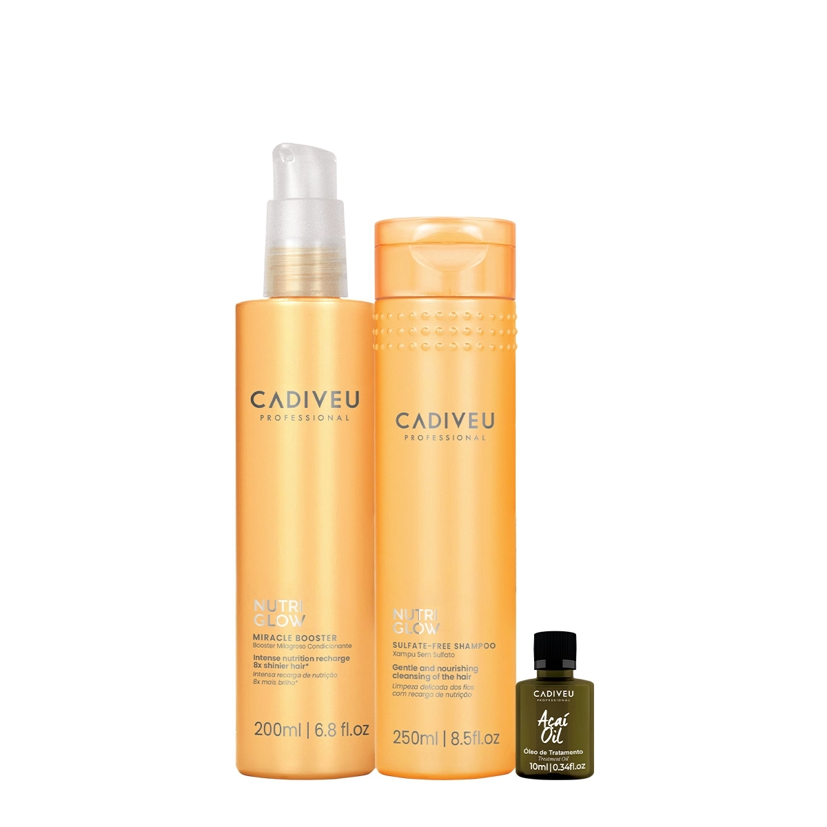 Esse Kit Contém Cadiveu Professional Nutri Glow Booster Fluído de Tratamento - Pré Shampoo ou Tratamento Noturno 200ml: o Booster possui fórmula altamente concentrada rico em óleos e manteigas nutre intensamente os cabelos ressecados, devolvendo a maciez e flexibilidade natural da fibra, o resultado são pontas seladas, arrepiados controlados e cabelos 8x mais brilhantes. Cadiveu Professional Nutri Glow - Shampoo sem Sulfato 250ml: oferece uma solução profissional instantânea para cabelos ressecados e sem vida. Um tratamento completo para fornecer a reposição lipídica que esses fios mais secos necessitam, alinhando as cutículas para trazer de volta o brilho, movimento, sedosidade e vitalidade. Cadiveu Professional Açaí Oil - Óleo de Tratamento Capilar 10ml: para restauração e nutrição de cabelos danificados. Sua fórmula ultraleve e não gordurosa é rapidamente absorvida sem deixar resíduos. Age na cutícula dos fios que é a parte mais danificada no dia a dia. Açaí Oil de Cadiveu nutre, hidrata e reaviva cabelos danificados de todos os tipos, sela e repara as pontas duplas, controla o frizz e protege contra os danos do sol, poeira, vento, umidade, secador e prancha. O segredo da Amazônia revelado na beleza de seus cabelos, um verdadeiro elixir para deixar os cabelos sedosos, nutridos, macios e com brilho sem igual! Conselho de AplicaçãoKit Cadiveu Professional Nutri Glow Shampoo Pré-Shampoo e Açaí Oil (3 produtos)