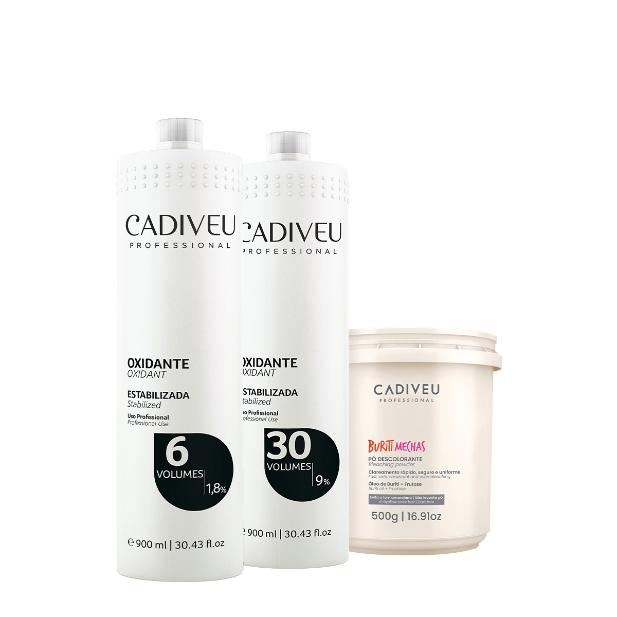 Esse kit contém Cadiveu Professional 6V - Oxidante 900ml: permite uma revelação eficiente e uniforme dos pigmentos. São estabilizados com 1,8% de Peróxido de Hidrogênio que associada à coloração permite uma revelação eficaz e uniforme dos pigmentos, sendo utilizada para tonalização dos fios, deixando o cabelo macio e sem perder o balanço. Cadiveu Professional 30V - Oxidante 900ml: clareia o tom em vários níveis de forma uniforme. Conta com uma fórmula estabilizada, que garante resultado homogêneo impecável. Quando usado em conjunto com colorações ou pó descolorante, promove uma abertura de até 8 tons. Para todos os tipos de cabelo. Cadiveu Buriti Mechas - Pó Descolorante 500g: ideal para todas as técnicas. Sua descoloração progressiva permite total uniformidade e regularidade. Oferece ao profissional diversas possibilidades de clareamento. Garante o máximo de eficácia, respeito à natureza dos fios e clareamento em tons frios, devido à exclusiva tecnologia anti-yellow. Conselho de AplicaçãoKit Cadiveu Professional Oxidante 6V 30v e Buriti Mechas (3 produtos)