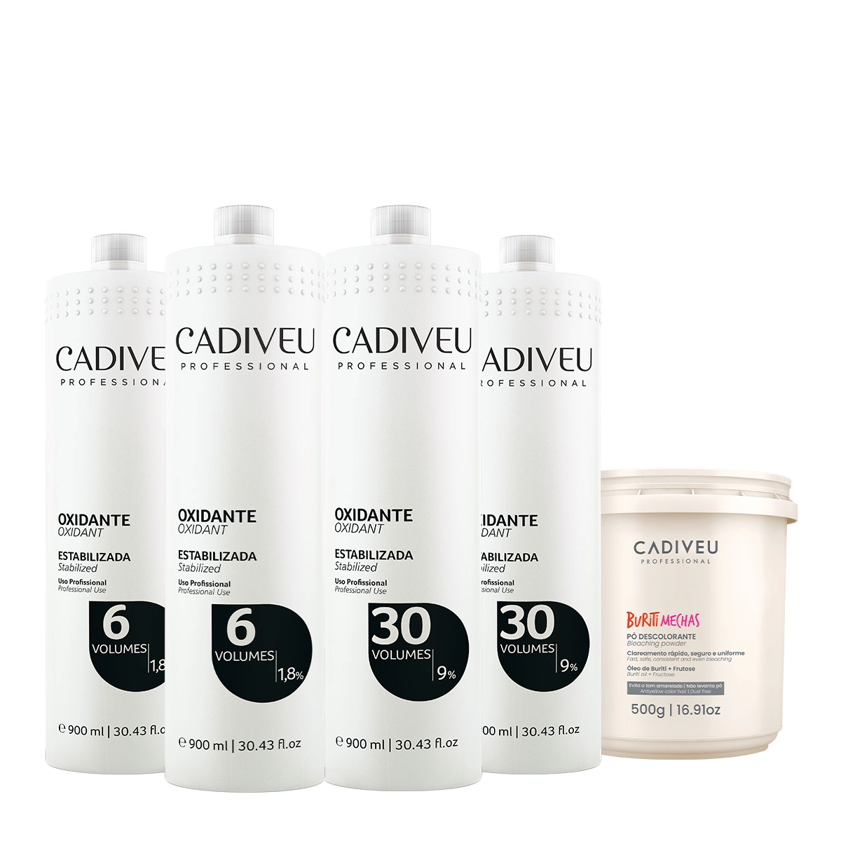 Esse kit contém Cadiveu Professional 6V - Oxidante 900ml (2unidades): permite uma revelação eficiente e uniforme dos pigmentos. São estabilizados com 1,8% de Peróxido de Hidrogênio que associada à coloração permite uma revelação eficaz e uniforme dos pigmentos, sendo utilizada para tonalização dos fios, deixando o cabelo macio e sem perder o balanço. Cadiveu Professional 30V - Oxidante 900ml (2 unidades): clareia o tom em vários níveis de forma uniforme. Conta com uma fórmula estabilizada, que garante resultado homogêneo impecável. Quando usado em conjunto com colorações ou pó descolorante, promove uma abertura de até 8 tons. Para todos os tipos de cabelo. Cadiveu Buriti Mechas - Pó Descolorante 500g: ideal para todas as técnicas. Sua descoloração progressiva permite total uniformidade e regularidade. Oferece ao profissional diversas possibilidades de clareamento. Garante o máximo de eficácia, respeito à natureza dos fios e clareamento em tons frios, devido à exclusiva tecnologia anti-yellow. Conselho de AplicaçãoKit Cadiveu Professional Oxidante 6V 30v Extra e Buriti Mechas (5 produtos)