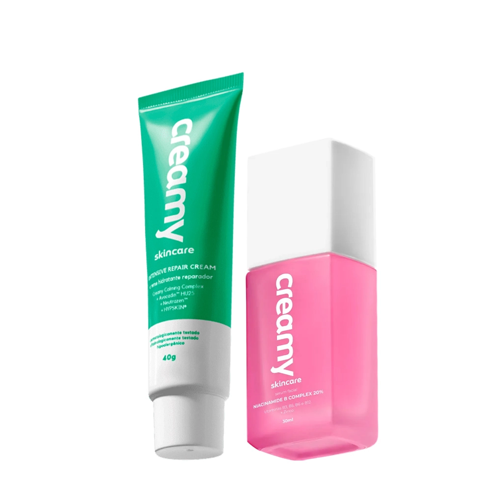 Este Kit Contém Creamy Niacinamide B Complex 20% - Sérum Ultraconcentrado 30ml: possui um blend de vitaminas (B3, B5, B6, B12 e E) que age no fortalecimento da barreira cutânea, melhorando a aparência, textura e tonalidade da pele. Ele garante o aumento da hidratação, reduz a aparência de poros dilatados e auxilia no controle da acne. Creamy Skincare - Creme Reparador 40g: hidratante reparador para peles intolerantes e sensíveis. Conselho de Aplicação Niacinamide B: uso diurno e noturno. Aplique uma fina camada sobre a pele completamente seca após sua rotina de limpeza facial. Hidratante Reparador: aplicar sobre a pele completamente seca de 1 a 2 vezes ao dia, espalhando até absorção completa. Reaplicar conforme desejado. Kit Creamy B Complex 20 e Creme Reparador (2 produtos)