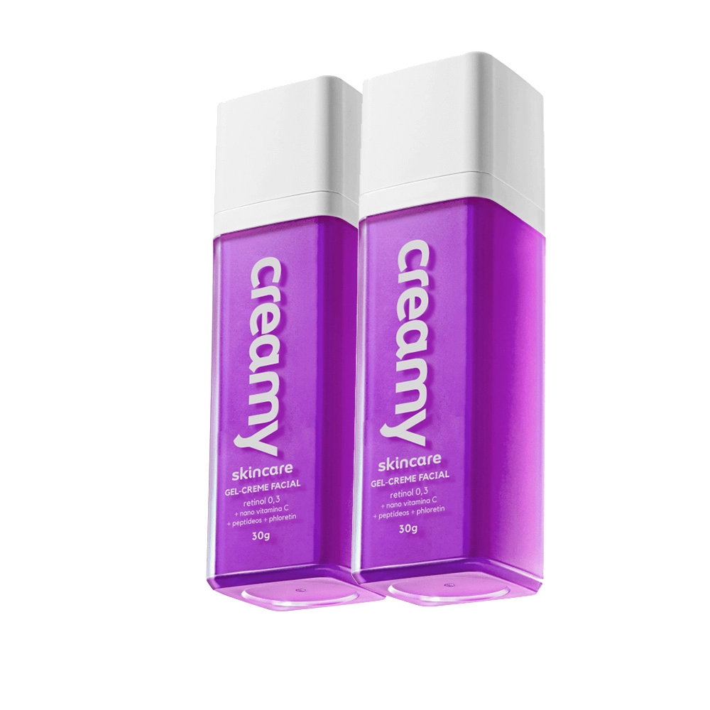 Kit Creamy Gel-Creme Retinol 0,3 - Antirugas Concentrado 30g (2 unidades) Creamy Skincare Retinol é um gel creme facial anti-idade de uso noturno. Sua fórmula contém 0,3% de retinol puro (Vitamina A), nano-vitamina C e Phloretin, com efeito antioxidante. Ele também possui peptídeos que promovem firmeza à pele e traz ainda ingredientes calmantes e reparadores que garantem conforto na aplicação. Conselho de Aplicação Uso Noturno. Aplique 1 ou 2 pumps sobre a pele seca e hidratada, evitando a região dos olhos, os cantos do nariz e da boca.