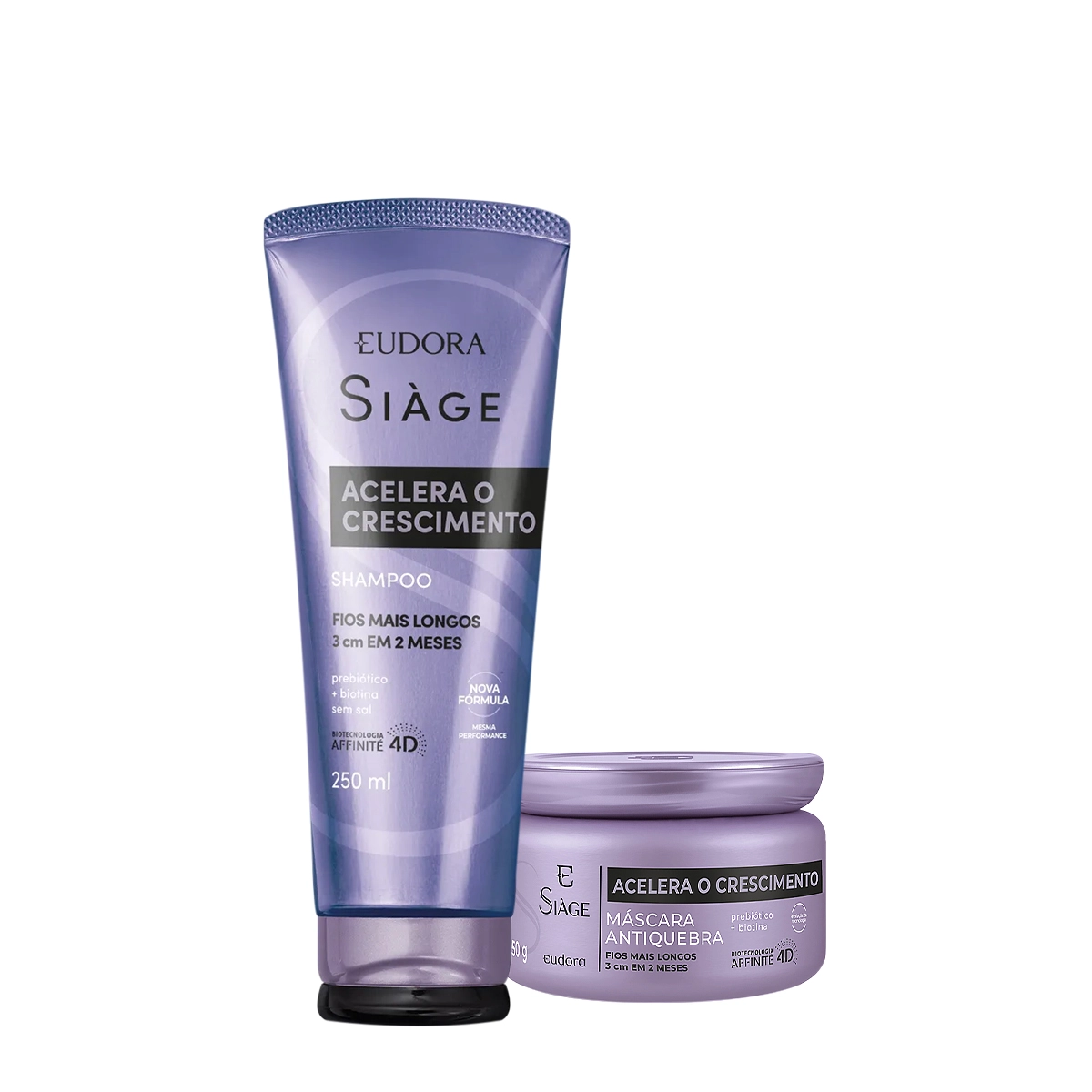 Este Kit Contém Eudora Siàge Acelera o Crescimento - Shampoo 250ml: limpa com uma espuma cremosa, não resseca e promove um crescimento saudável para os fios. Seus ativos atuam diretamente no equilíbrio do couro cabeludo e estimulam o crescimento. Reduz e previne a quebra natural, com menos quebra e aumenta a vitalidade dos fios. Eudora Siàge Acelera o Crescimento - Máscara Capilar 250g: sua ação antiqueda, fortalece e hidrata os fios. Com prebiótico e biotina, equilibra o couro cabeludo, ativa o metabolismo do fio e estimula o crescimento do cabelo. Proporciona fios saudáveis, com quebra e queda reduzidas e um crescimento de até 3cm em 2 meses. Kit Eudora Siàge Acelera o Crescimento Shampoo Máscara (2 produtos)