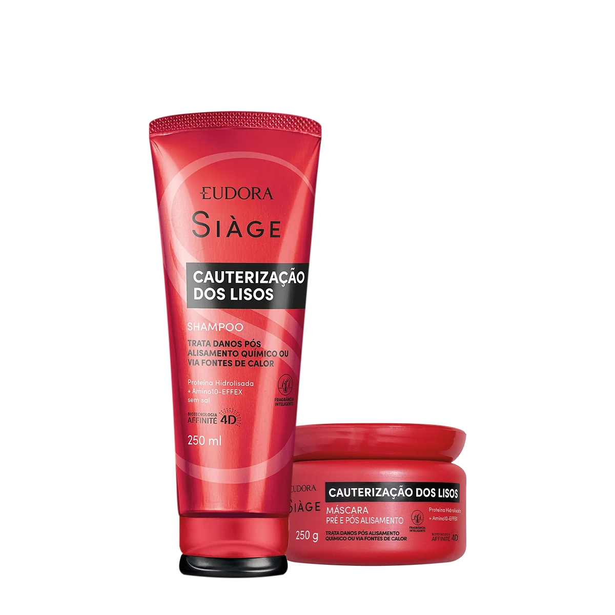 Este Kit Contém Eudora Siàge Cauterização dos Lisos - Shampoo 250ml: realiza a limpeza ideal para fios mais macios e lisos. Prepara o cabelo para receber o tratamento de cauterização. Com um blend de aminoácidos, fortalece a fibra capilar e combate o afinamento das pontas. Eudora Siàge Cauterização dos Lisos - Máscara Capilar 250g: para fios lisos, recuperados e até 3x mais macios. Com um blend de aminoácidos, repõe os nutrientes. Recupera e sela a fibra capilar, devolvendo a massa perdida, reduz o afinamento das pontas e garante a cauterização ideal para os fios alisados. Conselho de Aplicação Kit Eudora Siàge Cauterização dos Lisos Shampoo Máscara (2 produtos)