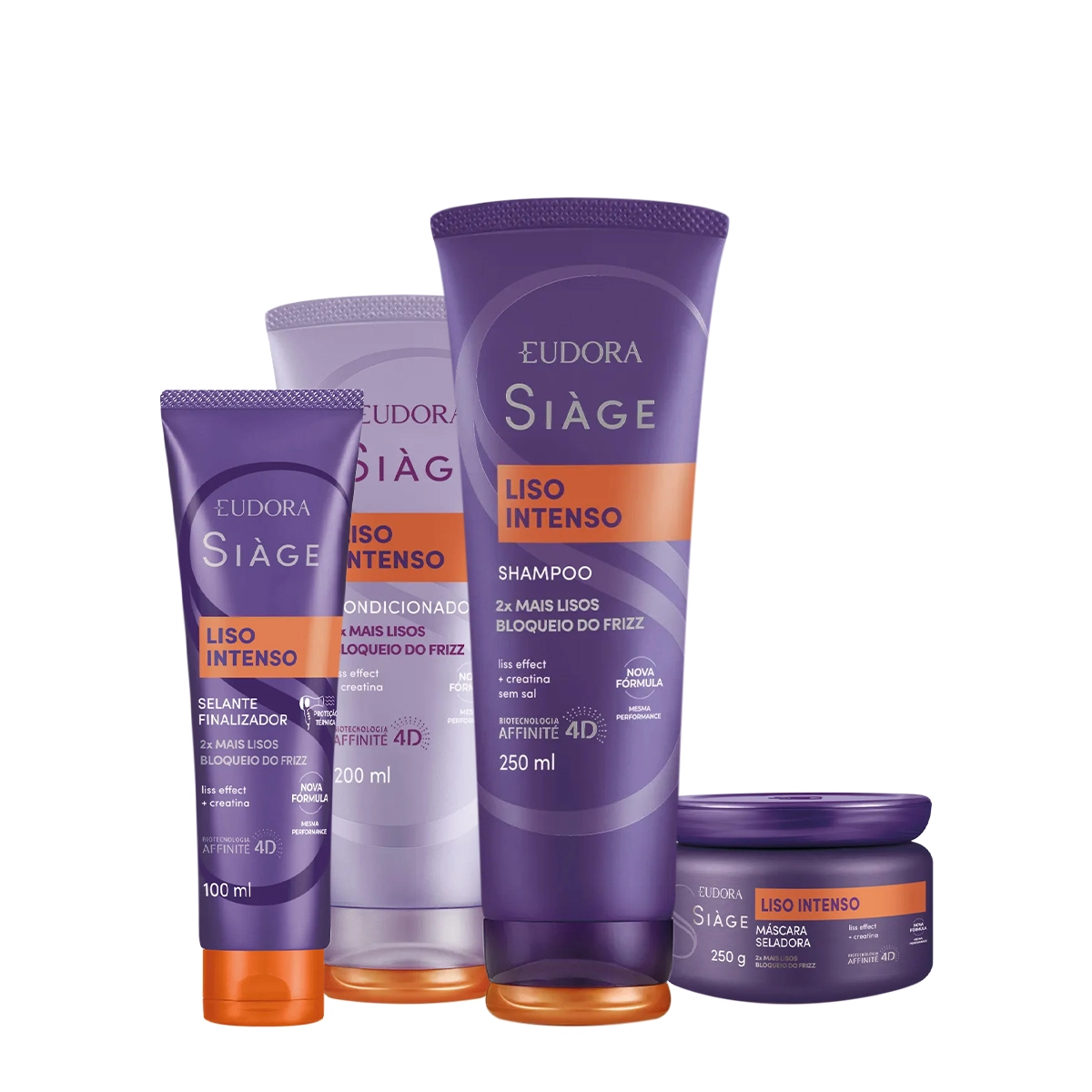 Este Kit Contém Eudora Siàge Liso Intenso - Shampoo 250ml: alinha os fios, deixando-os sem arrepiados. Sua fórmula bloqueia os agentes causadores do frizz e de fios indisciplinados, proporcionando maior maciez, hidratação e brilho. Protege os fios de ferramentas de calor até 230°. Eudora Siàge Liso Intenso - Condicionador 200ml: hidrata o cabelo e facilita o desembaraçar. Com fórmula inteligente, garante fios sem frizz, disciplinados, protegidos da quebra, macios, hidratados e com muito brilho. Eudora Siàge Liso Intenso - Máscara Capilar 250g: com poderosa ação seladora, proporciona um liso hidratado e alinhado. Possui fórmula inteligente que se adequa ao seu tipo de liso. Garante fios sem frizz, disciplinados e reduz em 71% a quebra causada pelo pentear. Eudora Siàge Liso Intenso Selante Finalizador - Leave-in 100ml: eficiente, proporciona fios mais alinhados. Com fórmula inteligente que se adequa ao seu tipo de liso e bloqueia os agentes causadores do frizz e de fios indisciplinados. Protege os fios do calor do secador e da chapinha até 230°c. Confere cabelos hidratados, macios e com muito brilho. Conselho de AplicaçãoKit Eudora Siàge Liso Intenso Hair Care Total (4 produtos)