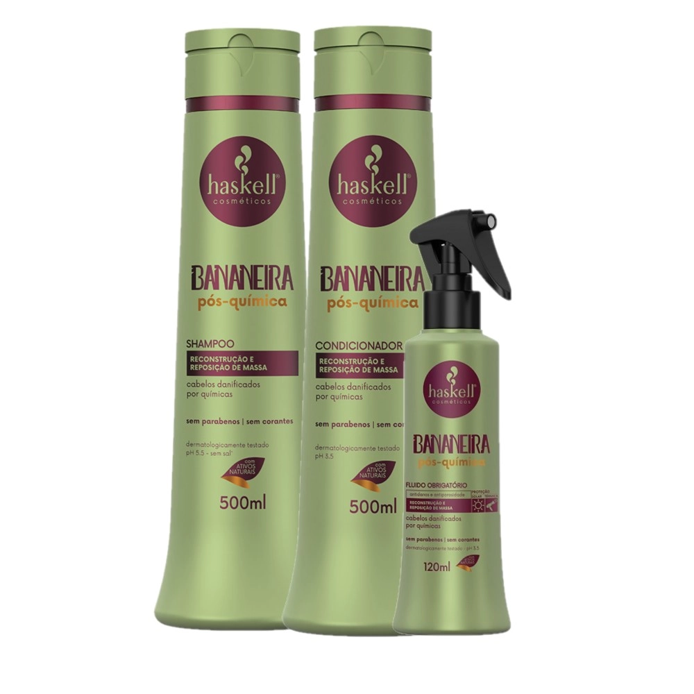 Kit para cabelos quimicamente tratados. Kit Haskell Bananeira Duo limpa e condiciona, óleos que nutrem e reparam os fios, protegendo-os contra danos futuros. Contém: Haskell Bananeira - Condicionador 500ml: Possui ação emoliente e hidratante, e sela as cutículas por meio de sua ação condicionante. Ideal para reconstruir os cabelos que passaram por procedimentos químicos. Haskell Bananeira - Fluido Obrigatório 120ml: É um reconstrutor capilar em spray que proporciona tratamento antiporosidade e antifrizz, recupera os fios fragilizados e protege contra danos futuros. Proporciona também maior penetrabilidade, condicionamento e maciez. Modo de uso Condicionador: Após lavar os cabelos, aplique o condicionador uniformemente, do comprimento às pontas. Massageie suavemente e deixe agir por 1 minuto. Enxágue bem. O uso do condicionador também é indicado após máscaras de tratamento, para promover maior selamento das cutículas. Fluido: agite antes de usar. Nos cabelos limpos e úmidos, borrife o Fluido Obrigatório em todo o comprimento dos fios e espalhe uniformemente pelos cabelos. Finalize como desejar. Sem enxágue. Potencialize os resultados utilizando toda a linha Bananeira Pós-Química.Kit Haskell Bananeira Home Care Fluido (3 produtos)
