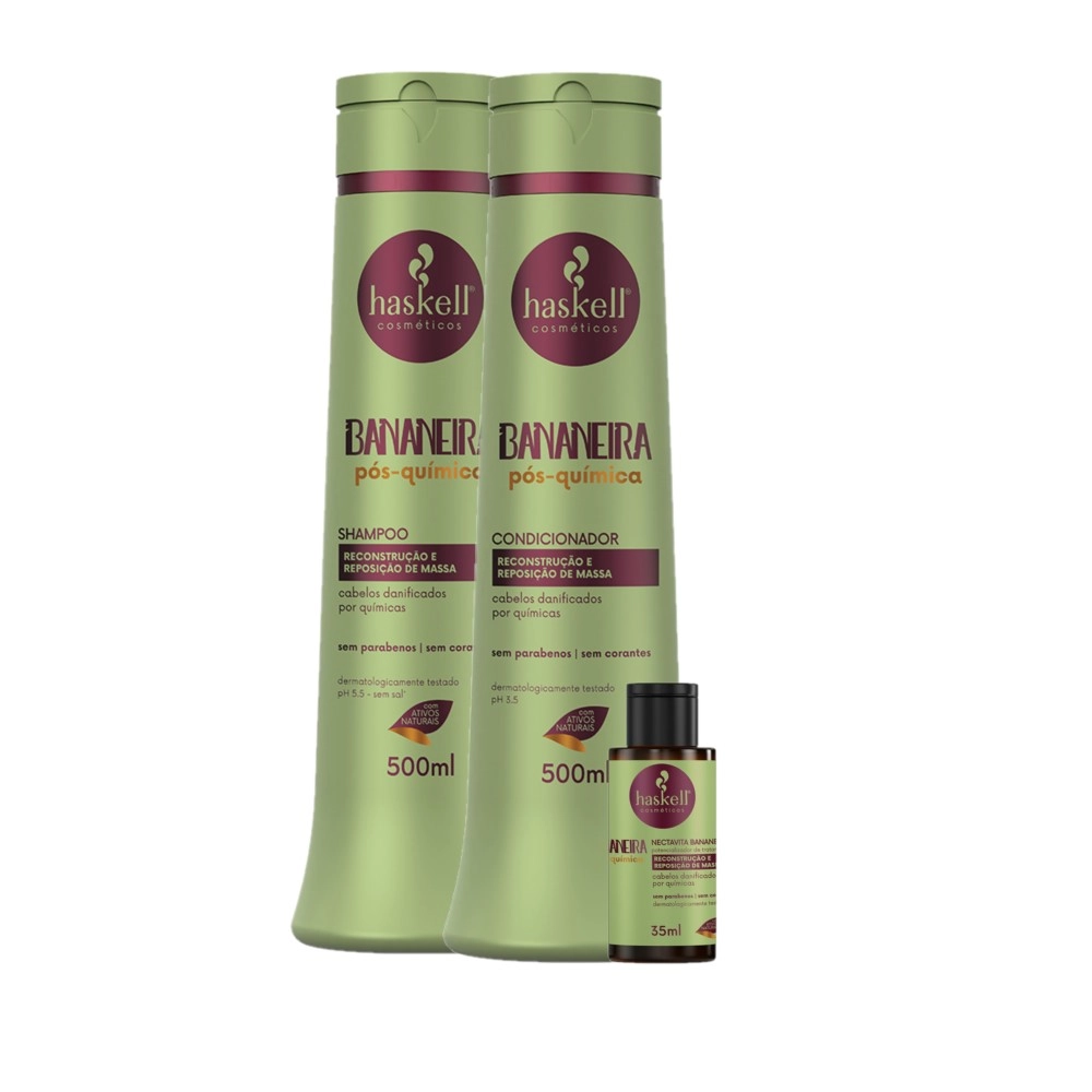 Haskell Bananeira - Condicionador 500ml: Possui ação emoliente e hidratante, e sela as cutículas por meio de sua ação condicionante. Ideal para reconstruir os cabelos que passaram por procedimentos químicos Haskell Bananeira - Nectavita 35ml: promove fios mais fortes, maleáveis e saudáveis, pois ajuda na reconstrução dos danos causados por químicas. Modo de uso Condicionador: Após lavar os cabelos, aplique o condicionador uniformemente, do comprimento às pontas. Massageie suavemente e deixe agir por 1 minuto. Enxágue bem. O uso do condicionador também é indicado após máscaras de tratamento, para promover maior selamento das cutículas. Nectativa: Adicione de 5 a 15ml do produto à quantidade que usará da sua máscara de preferência, prossiga como de costume.Kit Haskell Bananeira Limpeza Hidratação Nectativa (3 produtos)