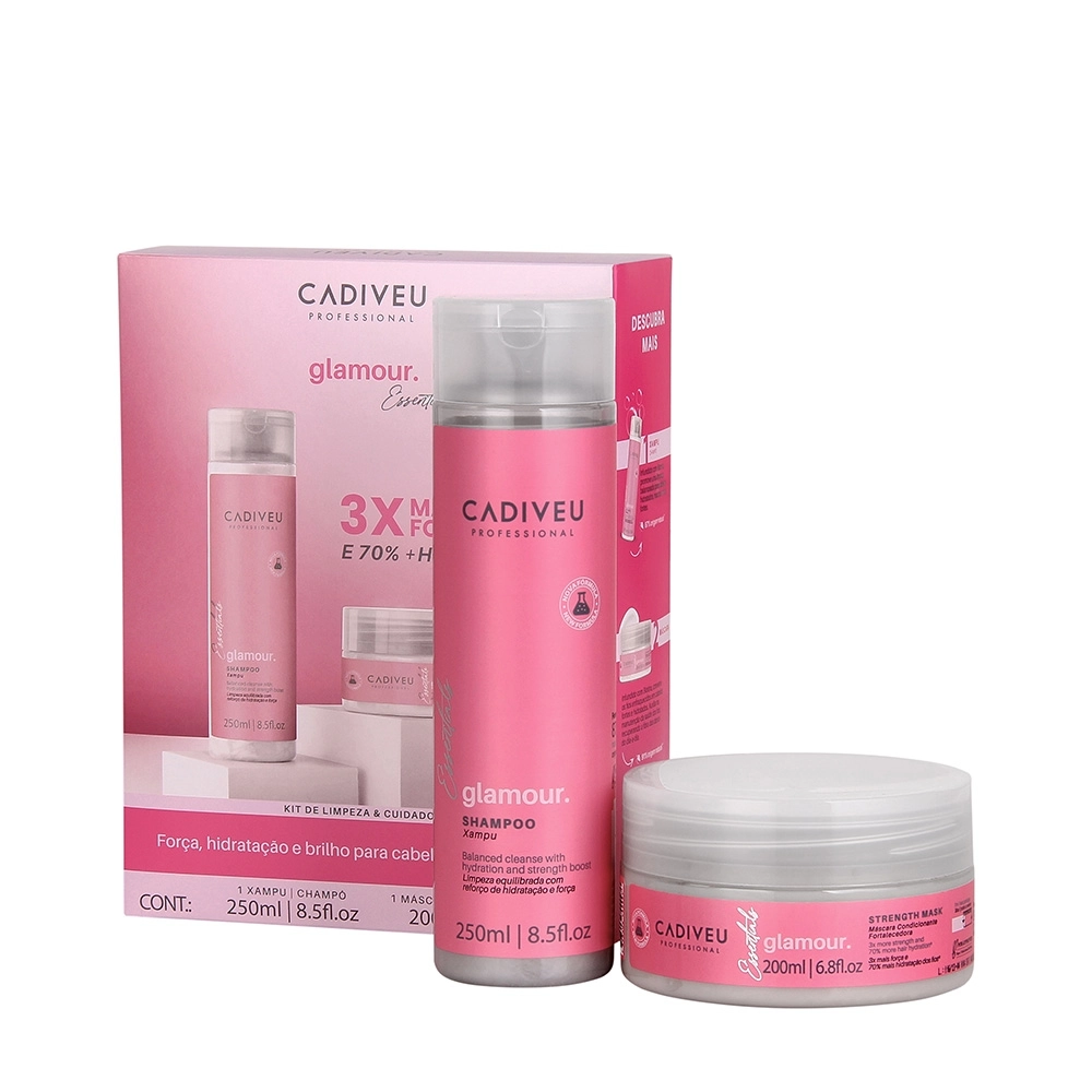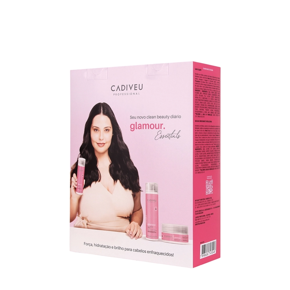 Novo kit de tratamento Glamour de uso diário enriquecido com Biotina e Extrato de Quinoa, transforma os fiosenfraquecidos, trazendo força e hidratação instantânea. Recupera os cabelos quebradiços em fios super macios e brilhantes. Específica para todos os tipos de cabelos fracos e desidratados. Funciona para cabelos lisos, alisados, cacheados, crespos ou ondulados. Cadiveu Professional Essentials Glamour - Mascara 200ml: é a solução perfeita para quem busca cabelos mais fortes, hidratados e brilhantes. Com sua nova fórmula infundida com Biotina, esta máscara é capaz de converter os fios enfraquecidos em cabelos 3x mais fortes e saudáveis, ajudando a recuperar os cabelos quebradiços e transformá-los em fios super macios e brilhantes. Conselho de AplicaçãoKit Home Care Cadiveu Essentials Glamour Shampoo e Máscara (2 produtos)
