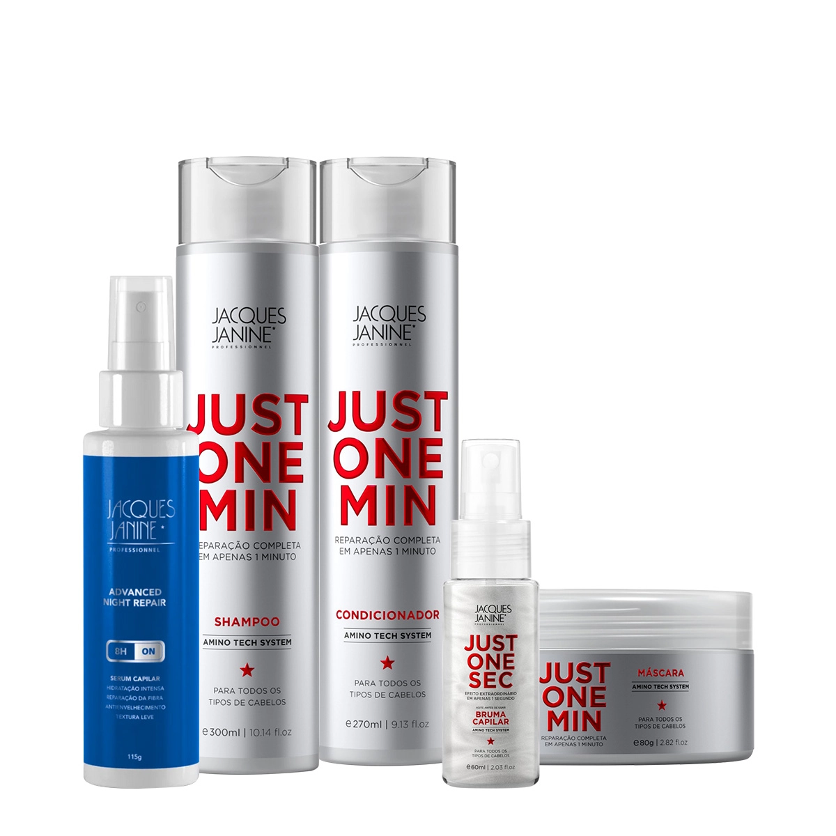 Kit Jacques Janine Professionnel Just One Min Shampoo Condicionador Máscara P Bruma e Night Sérum (5 produtos)