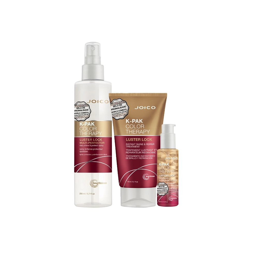Joico K-Pak Color Therapy Luster Lock - Leave in 200ml: contém fórmula que combina os benefícios hidratantes dos óleos exóticos que auxiliam no controle de danos, redução de pontas duplas e proporcionam fios 2 vezes mais fortes, desembaraça, protege os fios e combate o frizz. Joico K-PAK Color Therapy Luster Lock Smart Release - Óleo Capilar 63ml: foi especialmente desenvolvido para tornar a sua rotina de cuidados capilares muito mais prática, segura e eficiente. Com formulação poderosa e ingredientes de alta performance, o produto é ideal para manter a sua coloração viva e radiante por muito mais tempo. Joico K-PAK Color Therapy Luster Lock - Máscara Capilar 140ml: age repondo os lipídios perdidos, enquanto repara interna e externamente a estrutura do fio. Forma uma película de longa duração que mantém a integridade da fibra, além de oferecer alta ação antioxidante para proteger contra ação dos radicais livres. Repara os fios e dá brilho instantaneamente. Efeito de salão que deixa os cabelos macios, com muito movimento e com um brilho deslumbrante. Conselho de Aplicação Leave-in: agite bem. Borrife o leave-in por todo o comprimento e pontas dos fios limpos e úmidos. Não precisa de enxágue. Óleo: aplique de 1 a 2 doses de leave-in sobre os cabelos úmidos. Em seguida, penteie bem e finalize com o uso do secador. Máscara: para cabelos finos, aplique o tratamento em mechas úmidas e recém lavadas, no comprimento e pontas. Deixe agir de 1 a 3 minutos e enxágue abundantemente.Kit Joico K-Pak Color Therapy Brilho Perfeito (3 produtos)