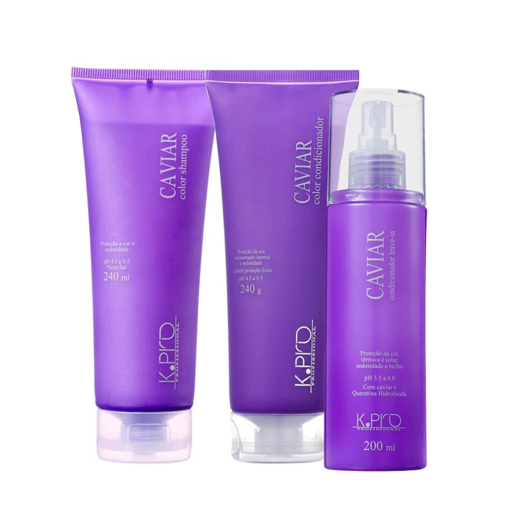 Esse kit Contém K.Pro Caviar Color - Condicionador 240g: para cabelos coloridos e danificados. Ele vem com antioxidantes, protege a cor e reconstrói os fios. Promove uma hidratação e reparação profundas do cabelo. Coloração duradoura, intensa e com muito brilho! K.Pro Caviar Spray - Leave-in 200ml: condicionador leave-in para todos os cabelos. Ele proporciona hidratação, brilho e sedosidade instantâneas. Protege os cabelos dos danos ambientais, restaura, desembaraça e ajuda a modelar os fios! Conselho de Aplicação Shampoo: aplique nos cabelos úmidos, massageie fazendo espuma e enxague. Repita se necessário. Condicionador: após lavar os cabelos com o shampoo, seque-os delicadamente com uma toalha e aplique o produto. Massageie ou penteie e deixe agir por 3 minutos. Enxague. Leave-in: pulverize sobre os fios úmidos ou secos e modele como desejar. Oferece proteção térmica, podendo ser usado com secador, chapa ou modelador de cachos.Kit K.Pro Profissional Caviar Shampoo Condicionador e Leave-in (3 produtos)