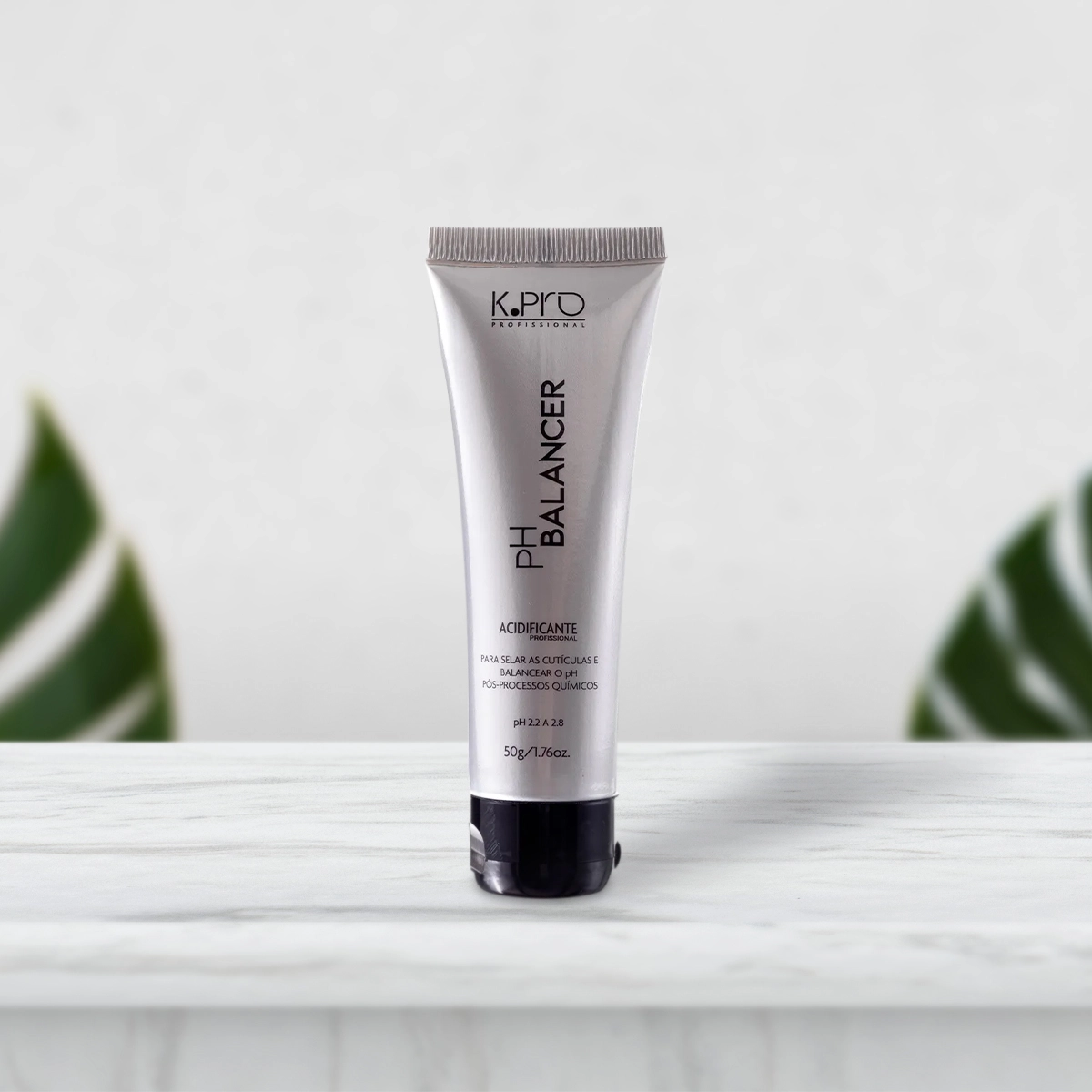 K.Pro Profissional pH Balancer - Acidificante Capilar 50g: para todos os tipos de cabelo. Reestabelece o equilíbrio dos fios e ajuda no alinhamento e selamento das cutículas. Potencializa tratamentos de hidratação e reconstrução, mantendo os nutrientes e ativos dentro da fibra capilar. Garante mais brilho, suavidade e maciez. Ideal para ser usado pós-química, reequilibrando os fios e aumentando a durabilidade da cor e dos tratamentos.
