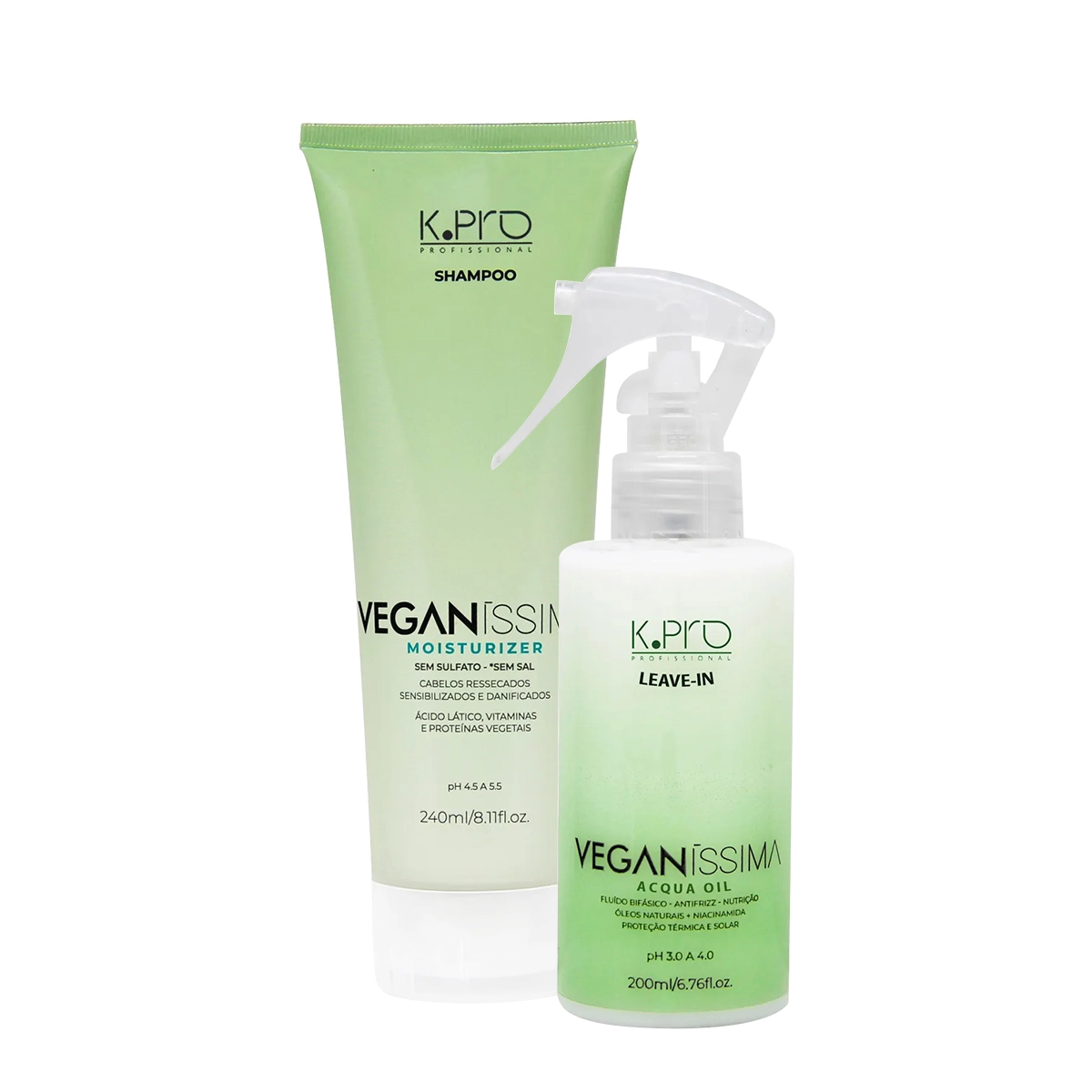 Esse Kit Contém K.Pro Veganíssima Moisturizer - Shampoo sem Sal 240ml: formulado com ativos naturais, veganos e biotecnológicos. Shampoo para hidratação e nutrição profunda, com tecnologia inovadora sem sulfato e sem sal, para proteger a camada ácida natural. K.Pro Veganíssima Acqua Oil - Spray Leave-in 200ml: bifásico, sem enxágue e para todos os tipos de cabelos. Combina tecnologia de blend antifrizz + alto poder umectante.Fluido, leve com proteção térmica e solar, promove brilho intenso. Ele possui 85% de ativos naturais. Hidrata e recria a camada ácida natural dos fios, inibindo a perda proteica e garantindo proteção do stress diário. Conselho de AplicaçãoKit K.Pro Veganíssima Moisturizer e Acqua Oil Leave-in (2 produtos)