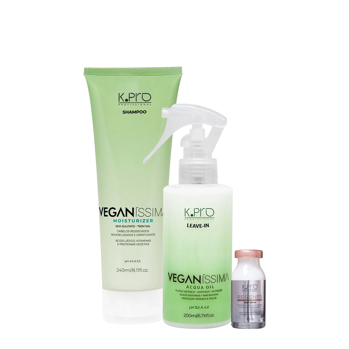Kit K.Pro Veganíssima Moisturizer Shampoo leave-in e Regenér Shot Repair (3 produtos)