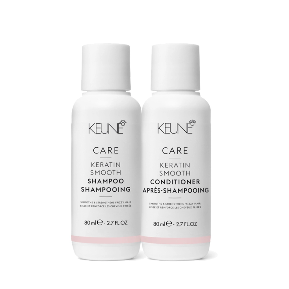 Kit Keune Care Keratin Smooth Duo Travel Size (2 produtos) Este Kit Contém Keune Care Keratin Smooth - Shampoo 80ml: para cabelos danificados age na reconstrução das áreas fragilizadas com o aumento da maleabilidade. reforça a fibra capilar com a reposição da proteína perdida devido às agressões, como uso constante de secador e chapinha, fatores ambientais e químicos, e aumenta a defesa dos fios de dentro para fora contra novos danos. Keune Care Keratin Smooth - Condicionador 80ml: para cabelos com química reduz frizz e previne quebra dos fios alisados definitivamente. Fortalece e repara o cabelo, repondo nutrientes e proteínas, para um cabelo muito mais forte e sedoso. Keune Care Keratin Smooth Conditioner repõe a queratina perdida durante processos químicos, reestruturando o fio e prevenindo a quebra, sendo ideal para cabelos com alisamento definitivo ou com mechas. Além disso, forma um filme protetor contra umidade e agressões externas, ajudando na durabilidade da química. Conselho de Aplicação