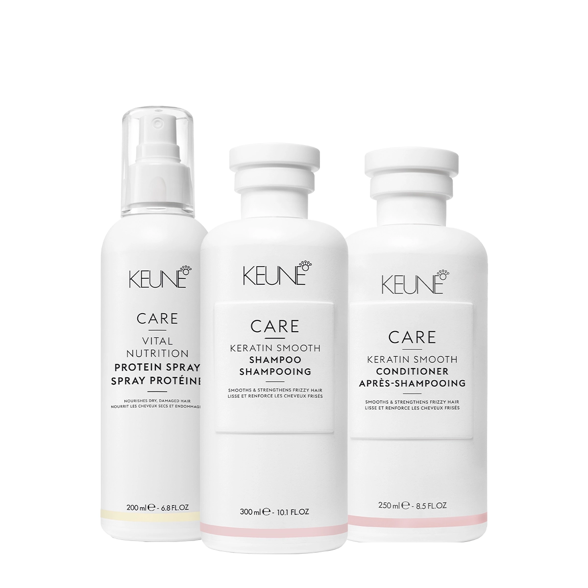 Esse Kit Contém Keune Care Keratin Smooth - Shampoo 300ml: para a reconstrução de áreas fragilizadas nos cabelos finos a médios, principalmente aquelas com danos causados por mechas e alisamentos, o Care Keratin Smooth Shampoo aumenta a defesa dos fios de dentro para fora. Sua fórmula repõe a fibra capilar perdida nas agressões químicas sofridas pelo cabelo. Kit Keune Care Keratin Smooth - Condicionador 250ml: um potente condicionador para cabelos finos médios, com mechas e alisamentos, que hidrata e desembaraça os fios. Também ajuda a encorpar, a nutrir e a fortalecê-los, deixando-os fáceis de lidar, além de realçar o brilho. O resultado é um visual bonito e cabelos maleáveis, menos vulneráveis à quebra. Keune Care Vital Nutrition Protein - Spray Condicionante Protetor 200ml: altamente desembaraçante, indicado para cabelos secos, porosos e danificados, Care Vital Nutrition Protein Spray protege os fios e o couro cabeludo nos processos químicos, principalmente antes de alisamentos e coloração/descoloração, evitando tração ao desembaraçar e, consequentemente, quebras. Conselho de AplicaçãoKit Keune Care Keratin Smooth Shampoo Condicionador e Style Dry Nº11 (3 produtos)