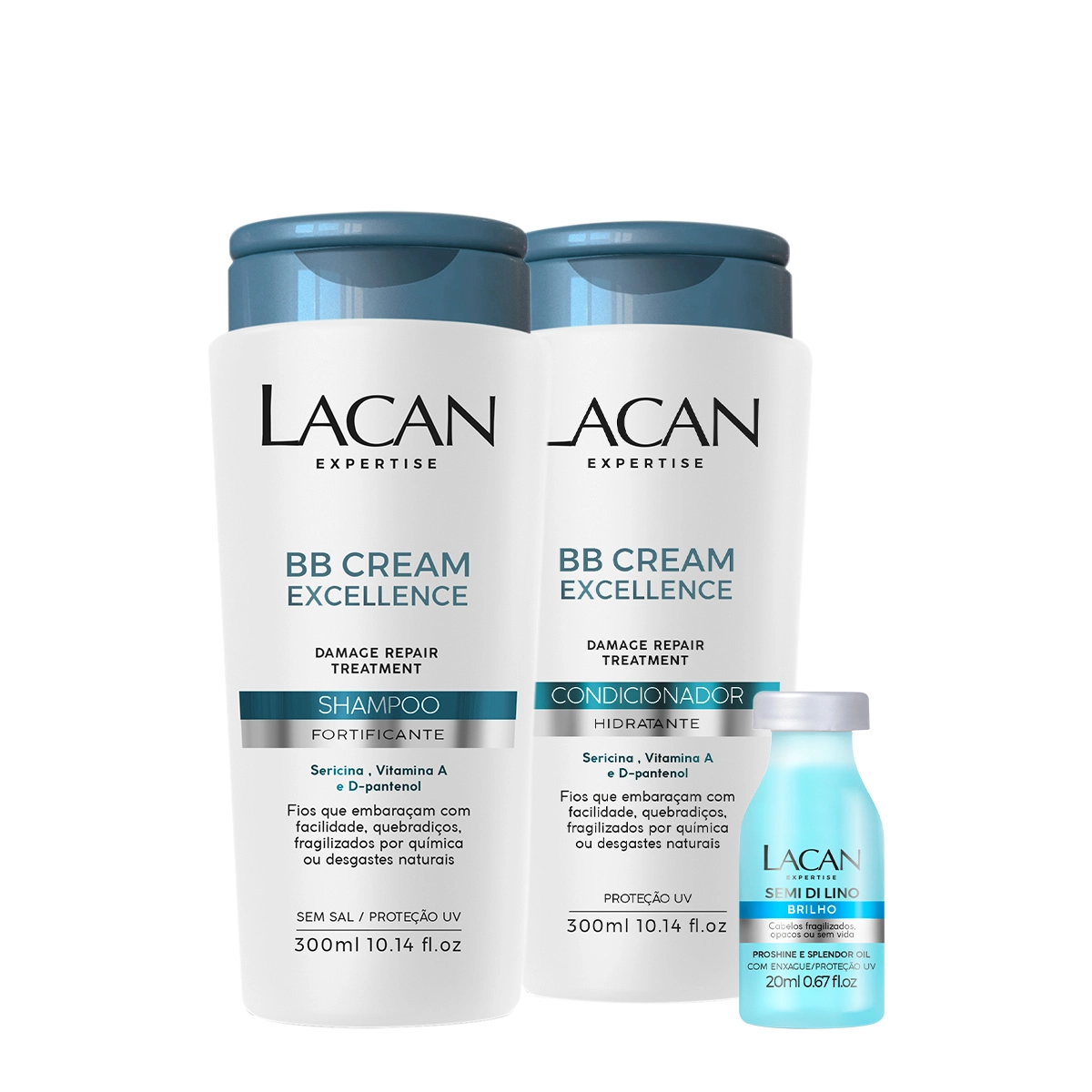 Kit Lacan BB Cream Fortificante e Nutricao (3 Produtos) Kit Lacan BB Cream Excellence vai restaurar a saúde dos seus fios fragilizados. Os produtos possuem ingredientes a base de Sericina, Vitamina A e D-Pantenol, que promovem ação desembaraçante, hidratação e maior resistência às madeixas.