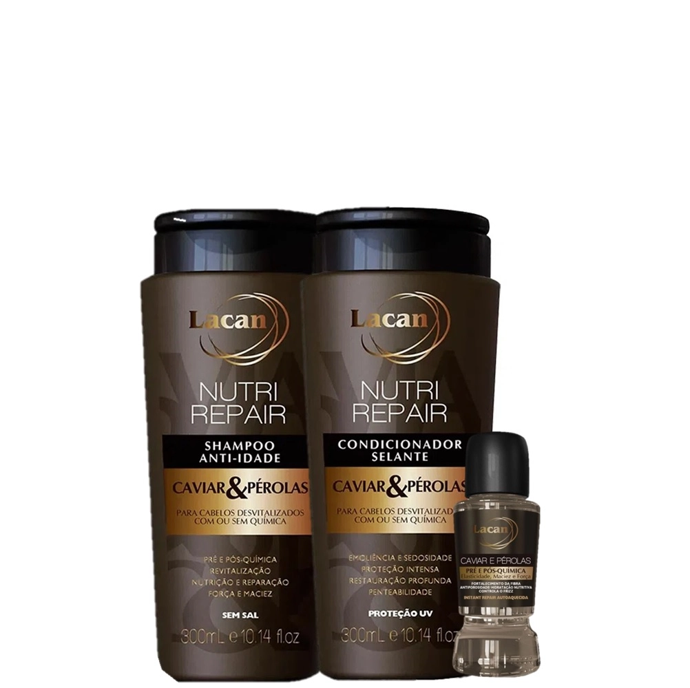 Linha Nutri Repair, à base de Caviar e Perolas, reúne ingredientes essenciais para a reestruturação dos fios. Nutre, repara os danos, hidrata, fortalece e promove brilho absoluto. Repõe a umidade natural dos cabelos perdida durante os processos químicos e/ou térmicas. Revitaliza os cabelos, além de proteger e defender dos futuros processos oxidativos. Este Kit Contém Shampoo Anti idade Caviar & Perolas 300ml :A base de Caviar e Perolas, confere aos cabelos higienização com ação restaurante e anti-idade revitalizando a beleza natural dos fios, promovendo maciez e brilho intenso. Condicionador Selante Caviar e Perolas 300ml: Hidrata e sela os ativos que reparam os danos da estrutura dos fios. Promove brilho radiante. Ampola de Caviar e Pérolas 17ml: com ação intensa nutritiva dos fios. O grande diferencial é que, por ser autoaquecida, ganha consistência cremosa tipo chantilly, proporcionando maior rendimento e melhor espalhabilidade. Além de ação mais profunda dos ativos na estrutura do fio. O resultado é o cabelo macio, com leveza, balanço e muito brilho Como Usar Conselho de Aplicação No cabelo molhado, aplique uma porção generosa do shampoo. Massageie com as pontas dos dedos em movimentos circulares. Enxague bem e, se necessário, repita o procedimento. No cabelo limpo e ainda molhado, aplicar este condicionador para hidratar e selar os fios. Após lavar o cabelo com shampoo, na palma da mão levemente úmida, aplicar uma pequena quantidade do produto e friccionar até ganhar consistência de chantilly. Espalhar no cabelo do comprimento até as pontas e deixar agir por 3 minutos ou mais. Enxaguar bem. Kit Lacan Caviar e Perolas Anti-Idade (3 Produtos)