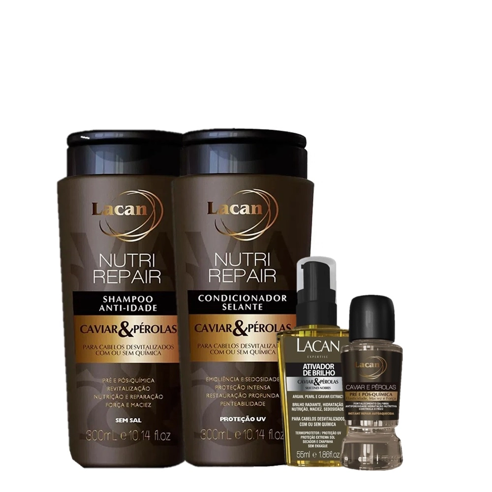 Linha Nutri Repair, à base de Caviar e Pérolas, reúne ingredientes essenciais para a reestruturação dos fios. Nutre, repara os danos, hidrata, fortalece e promove brilho absoluto. Repõe a umidade natural dos cabelos perdida durante os processos químicos e/ou térmicas. Revitaliza os cabelos, além de proteger e defender dos futuros processos oxidativos. Este Kit Contém Shampoo Anti idade Caviar & Perolas 300ml:A base de Caviar e Perolas, confere aos cabelos higienização com ação restaurante e anti-idade revitalizando a beleza natural dos fios, promovendo maciez e brilho intenso. Condicionador Selante Caviar e Perolas 300ml: Hidrata e sela os ativos que reparam os danos da estrutura dos fios. Promove brilho radiante. Ampola de Caviar e Pérolas 17ml: com ação intensa nutritiva dos fios.O grande diferencial é que, por ser autoaquecida, ganha consistência cremosa tipo chantilly, proporcionando maior rendimento e melhor espalhabilidade. Além de ação mais profunda dos ativos na estrutura do fio.O resultado é o cabelo macio, com leveza, balanço e muito brilho Ativador de Brilho Caviar e Perolas 55ml: reúne ingredientes essenciais para a reestruturação dos fios, Nutre, repara os danos, hidrata, fortalece e promove brilho absoluto. Revitaliza os cabelos, além de proteger e defender dos futuros processos químicos. Como Usar Conselho de Aplicação No cabelo molhado, aplique uma porção generosa do shampoo. Massageie com as pontas dos dedos em movimentos circulares. Enxague bem e, se necessário, repita o procedimento. No cabelo limpo e ainda molhado, aplicar este condicionador para hidratar e selar os fios. Após lavar o cabelo com shampoo, na palma da mão levemente úmida, aplicar uma pequena quantidade do produto e friccionar até ganhar consistência de chantilly. Espalhar no cabelo do comprimento até as pontas e deixar agir por 3 minutos ou mais. Enxaguar bem. Após fazer o procedimento térmico (escova/chapinha), borrifar um pouco do produto da extensão dos fios até as pontas para ativar o brilho extraordinário. Pode ser usado também antes dos procedimentos térmicos, Não é necessário enxaguar.Kit Lacan Caviar e Perolas Anti-Idade (4 Produtos)