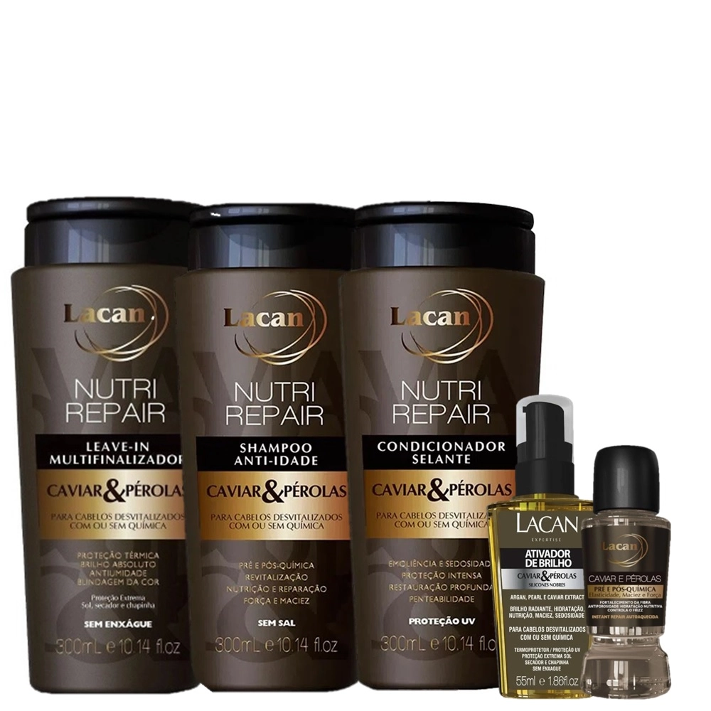 A Linha Nutri Repair, a base de Caviar e Perolas, reúne ingredientes essenciais para a restauração dos fios. Nutre, repara os danos, hidrata, fortalece e promove brilho absoluto. Repõe a umidade natural dos cabelos perdida durante os processos químicos e/ou térmicos. Revitaliza além de proteger e defender dos futuros processos oxidativos. Este Kit Contém Shampoo Anti idade Caviar & Perolas 300ml:A base de Caviar e Perolas, confere aos cabelos higienização com ação restaurante e anti-idade revitalizando a beleza natural dos fios, promovendo maciez e brilho intenso. Condicionador Selante Caviar e Perolas 300ml: Hidrata e sela os ativos que reparam os danos da estrutura dos fios. Promove brilho radiante. Leave in Multifinalizador 300ml: Enriquecido com Silicones Nobres e Filtro Solar, este leave in multifinalizador confere aos cabelos proteção térmica, blindagem da cor, ação defrizante, intensa proteção contra os raios UV, poluição e umidade. Ampola de Caviar e Pérolas 17ml: com ação intensa nutritiva dos fios .O grande diferencial é que, por ser autoaquecida, ganha consistência cremosa tipo chantilly, proporcionando maior rendimento e melhor espalhabilidade. Além de ação mais profunda dos ativos na estrutura do fio. O resultado é o cabelo macio, com leveza, balanço e muito brilho Ativador de Brilho Caviar e Perolas 55ml: reúne ingredientes essenciais para a reestruturação dos fios, Nutre, repara os danos, hidrata, fortalece e promove brilho absoluto. Revitaliza os cabelos, além de proteger e defender dos futuros processos químicos. Como Usar Conselho de Aplicação No cabelo molhado, aplique uma porção generosa do shampoo. Massageie com as pontas dos dedos em movimentos circulares. Enxague bem e, se necessário, repita o procedimento. No cabelo limpo e ainda molhado, aplicar este condicionador para hidratar e selar os fios. No cabelo limpo e úmido, aplicar uma quantidade moderada do produto da extensão dos fios até as pontas. deixar secar naturalmente ou finalizar com procedimentos térmicos. Não é necessario enxaguar. Após fazer o procedimento térmico (escova/chapinha), borrifar um pouco do produto da extensão dos fios até as pontas para ativar o brilho extraordinário. Pode ser usado também antes dos procedimentos térmicos, Não é necessário enxaguar.Kit Lacan Caviar e Perolas Cabelos Brilhosos (5 Produtos)